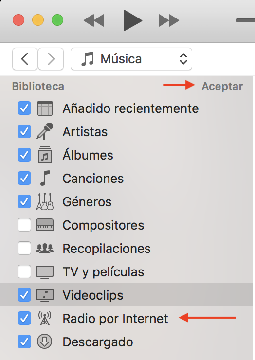 Al pulsar en Edición me han aparecido opciones que no tenía activadas. He activado Radio por internet y después he pulsado en Aceptar