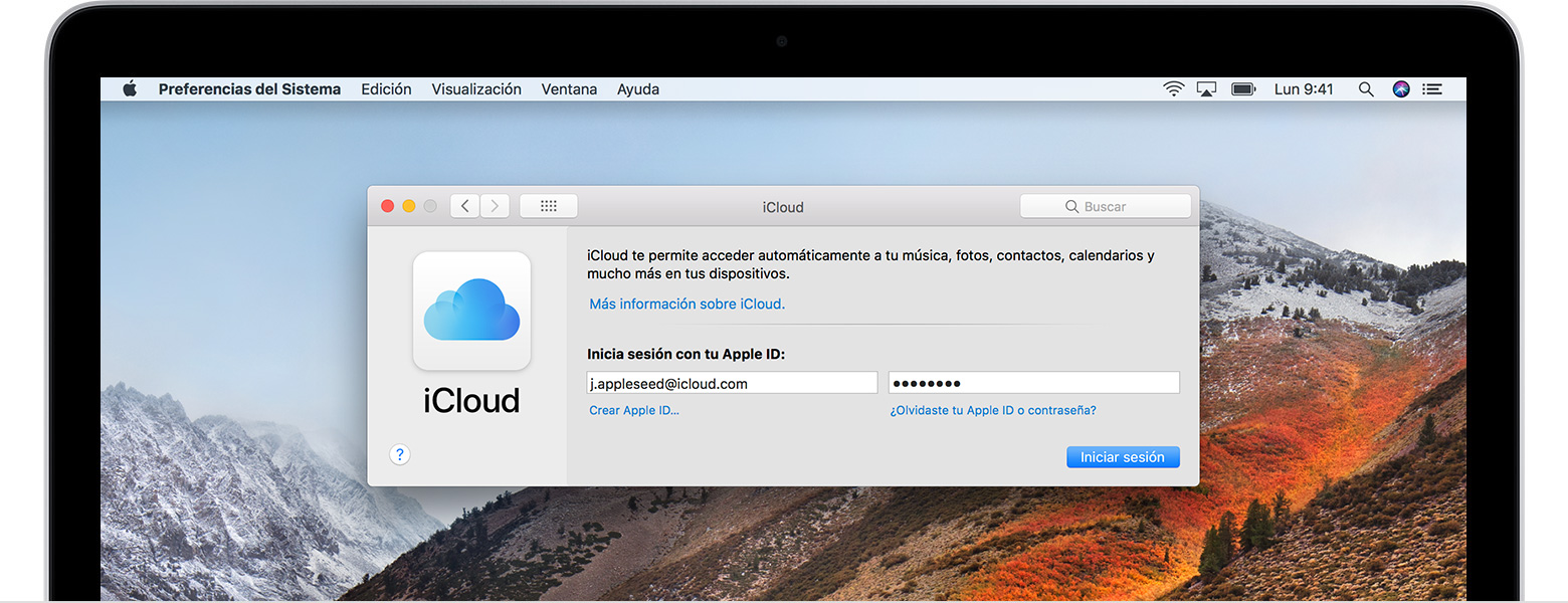 Ve a Preferencias del Sistema > iCloud. Ingresa tu Apple ID y tu contraseña, y haz clic en Iniciar sesión.