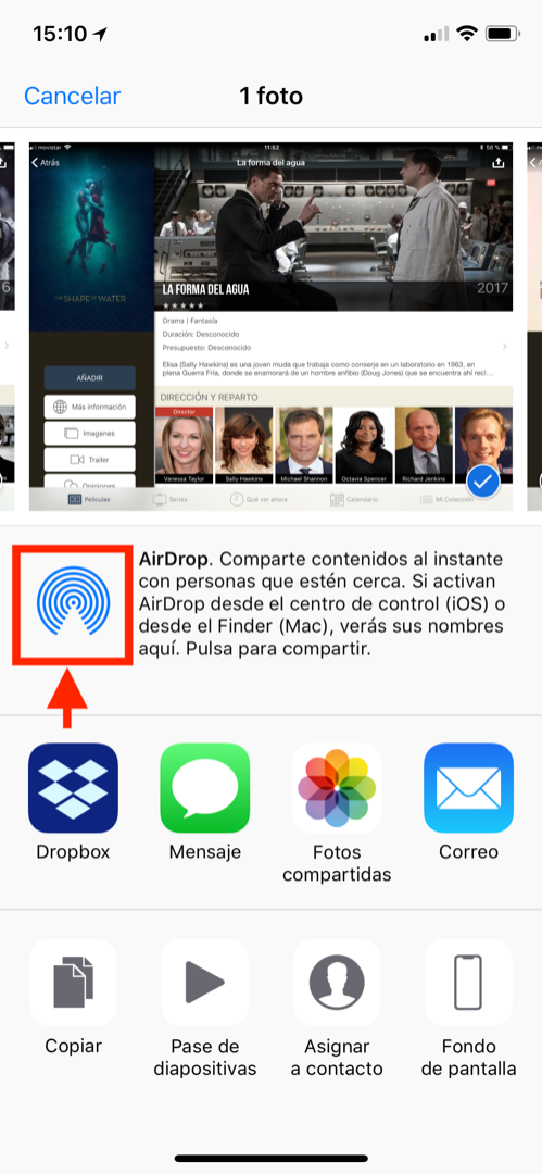 Cuando se abran las opciones para compartir, lo primero que aparece es AirDrop justo debajo de las fotos, y te aparecerán los dispositivos disponibles, que tienen que estar cerca, encendidos y con el bluetooth y el wifi activado. Incluso los que no son tuyos (léete el enlace de Apple que te he mandado sobre AirDrop)