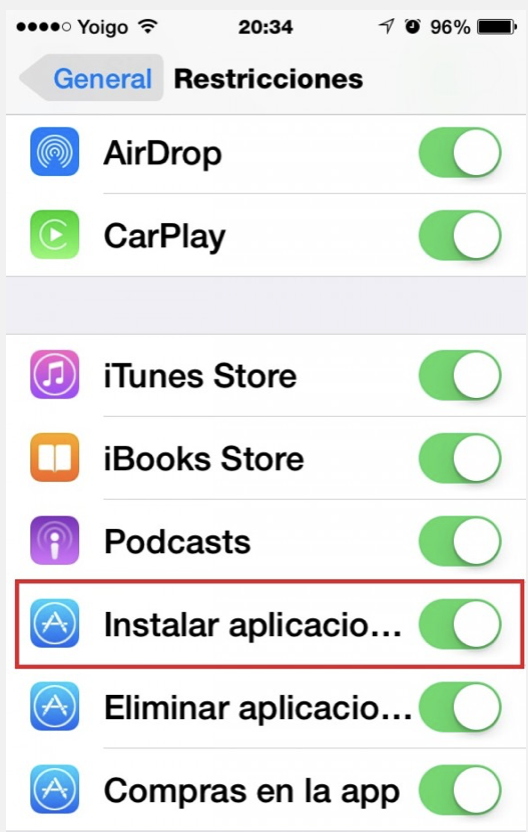 La restricción que impide que se descarguen aplicaciones, es la que hace que desaparezca el icono de la pantalla del iPhone.