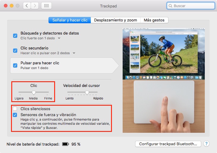 Tengo una leve incidencia con mi Magic Trackpad 2. A priori todo funciona correctamente, pero al hacer click en él, no hace el efecto click mecánico (el sonido click), a pesar de que funcionalmente hace click, detectando, también, todos gestos que se hacen en él. Solamente parece que el efecto de click mecánico ha dejado de funcionar (pulso fuerte sobre el trackpad, pero este efecto de click ya no se realiza) a pesar de que realiza el click a nivel de Software. El problema es meramente mecánico, pero no sé si está averiado o simplemente se puede cambiar esto con alguna configuración.