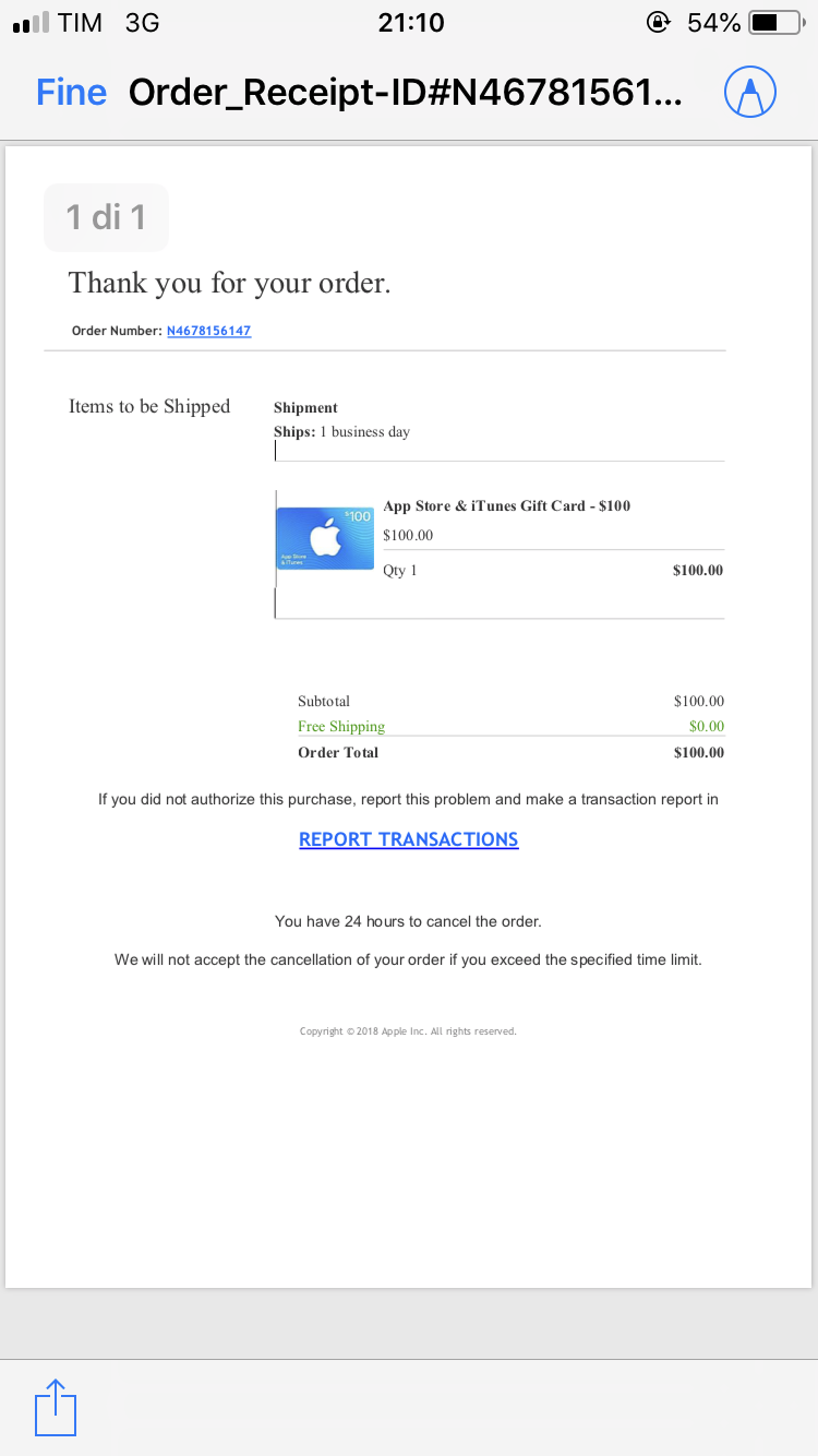 me llego una Email de apple conformandome una compra ( no se de que) de 100€ y cuando le doy a reportar, me da error!