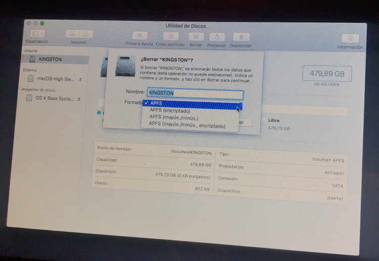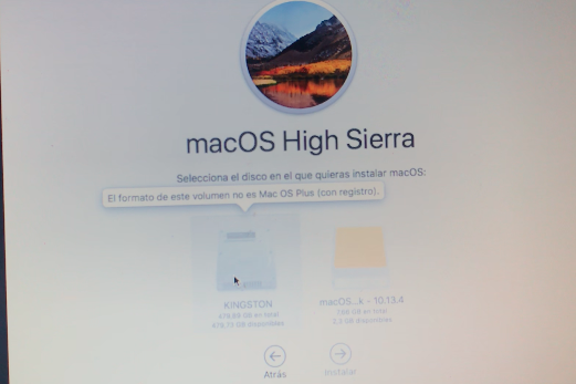 le estaba cambiando el disco duro del MacBook Pro mid 2012 a un amigo por un SSD, apago el equipo y prendo con alt apretado. Entro a Utilidad de disco para formatear el SSD nuevo y darle un formato para Mac y elijo APFS ya que es el nuevo formato recomendado para los SSD+High Sierra, hago el formato y luego (con un pendrive con High Sierra 10.13.4) voy a la opción de elegir el disco donde instalaré el SO, pero al llegar a este paso me dice "El formato de este volumen no es Mac OS Plus (con registro)"