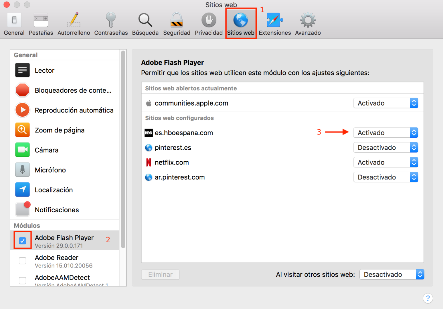 Pulsa ahora en Sitios web, activa Adobe y activa finalmente HBO