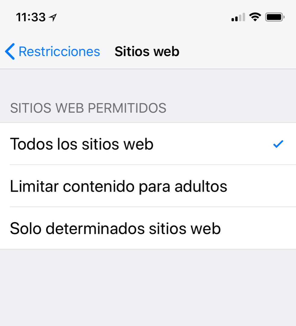 Cuando vayas a Restricciones-Contenido permitido-Sitios web, te dará varias opciones. Comprueba que está marcada Todos los sitios web para que no haya ninguna restricción.