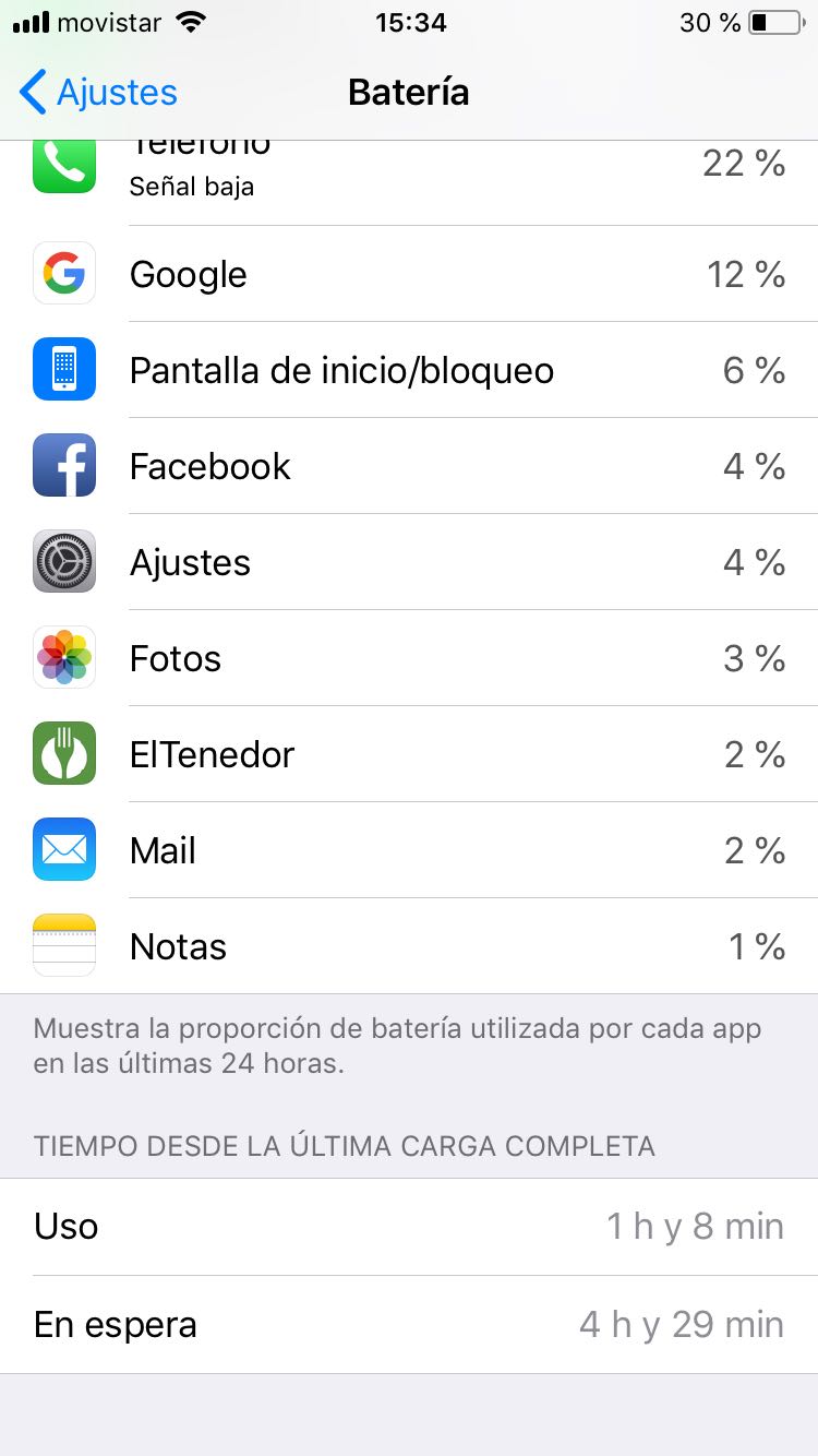El problema es que la duración de la batería es la misma a pesar de tener una batería totalmente nueva con el 100% de capacidad. No consigo que dure más de unas 6 horas, y como se puede ver en la captura tengo el 30% con apenas 1 hora de uso de whatsapp y 4 en espera.