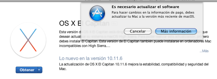 El problema final viene porque al clickar sobre Revisar, me da otro error Es necesario actualizar el software. Para hacer cambios en la información de pago, debes actualizar tu Mac a la versión más reciente de macOS.: