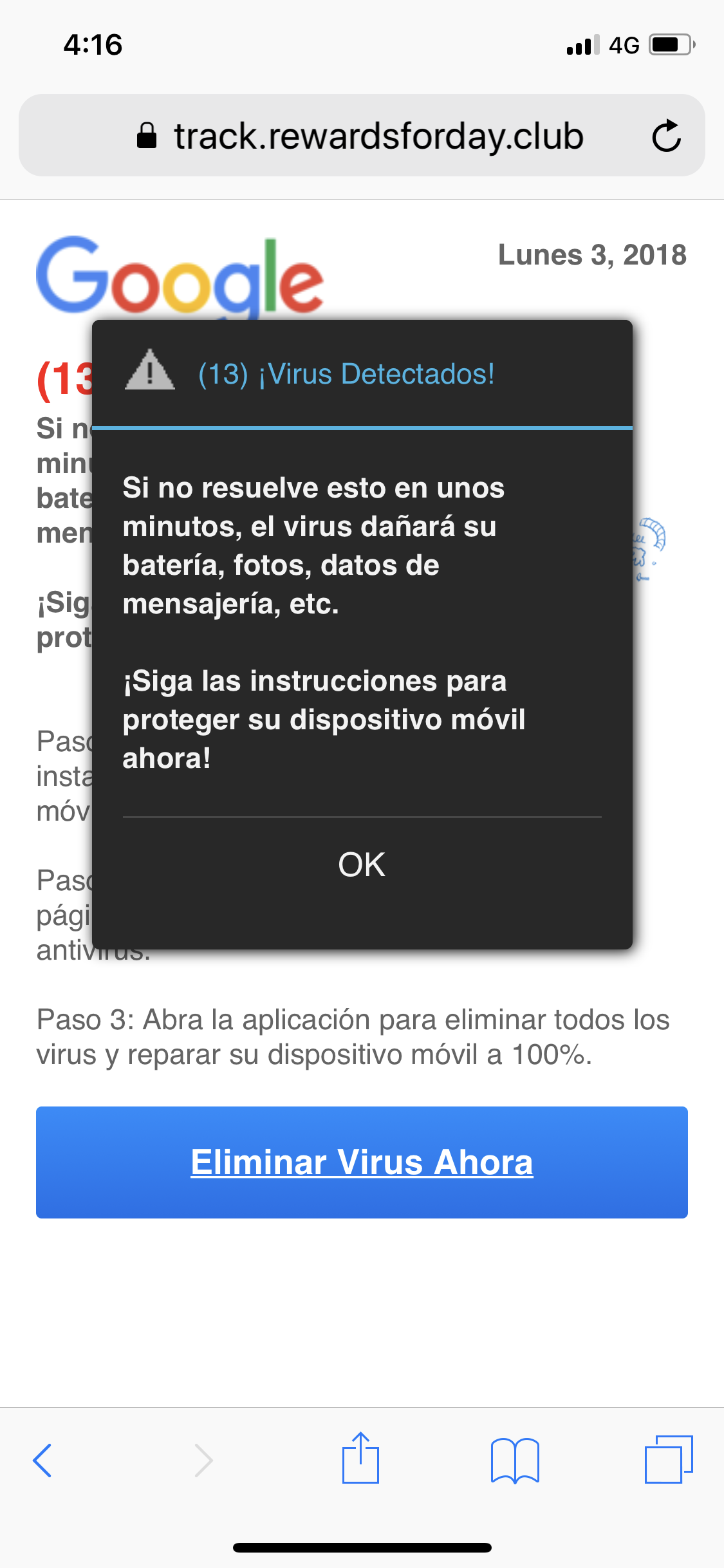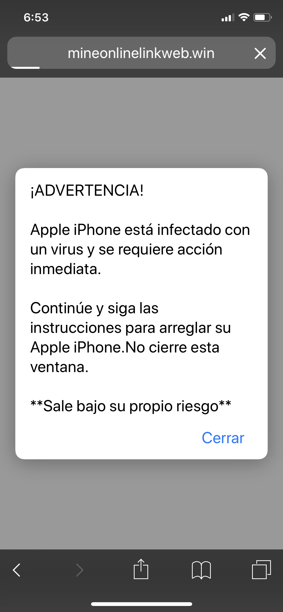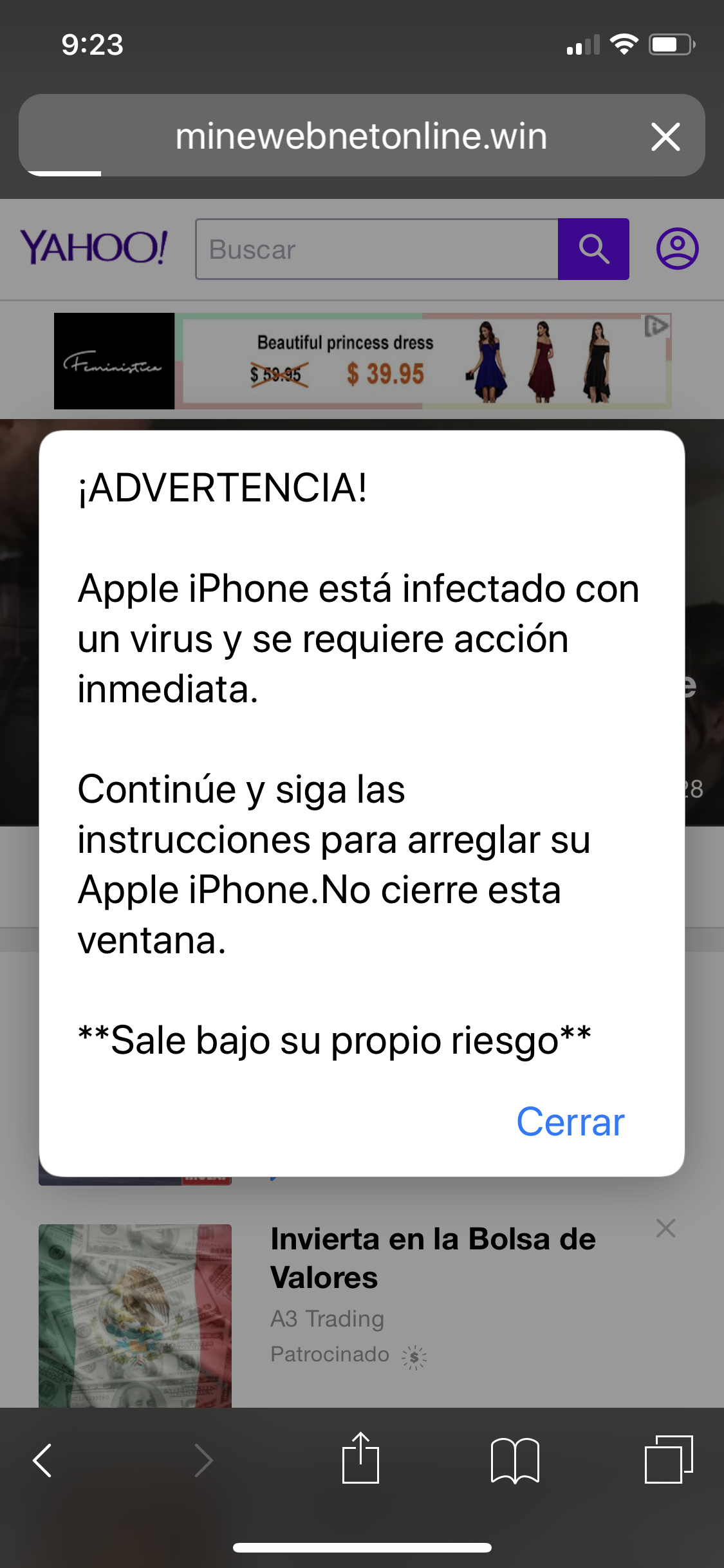 Al abrir el navegador por default de mi iphoneX y seleccionar yahoo, al navegar por unos segundos de inmediato me sale un mensaje de que el telefono tiene un virus y que debo seguir unas instrucciones para que se eliminen esos virus. Como puedo eliminar este mensaje de virus que me aparece cada que quiero navegar en ios 11.4.1 en iphoneX
