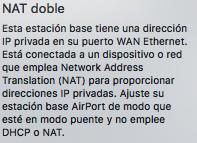 Gracias, acabo de resetear todo y configurar las dos Airport que tengo con una de ellas en base Wi-Fi ampliada, me da un par de errores en las Airport, la principal dice: NAT DOBLE, y que la ponga en modo puente (antes la tenia asi) pues dice Archivo cargado por el usuario