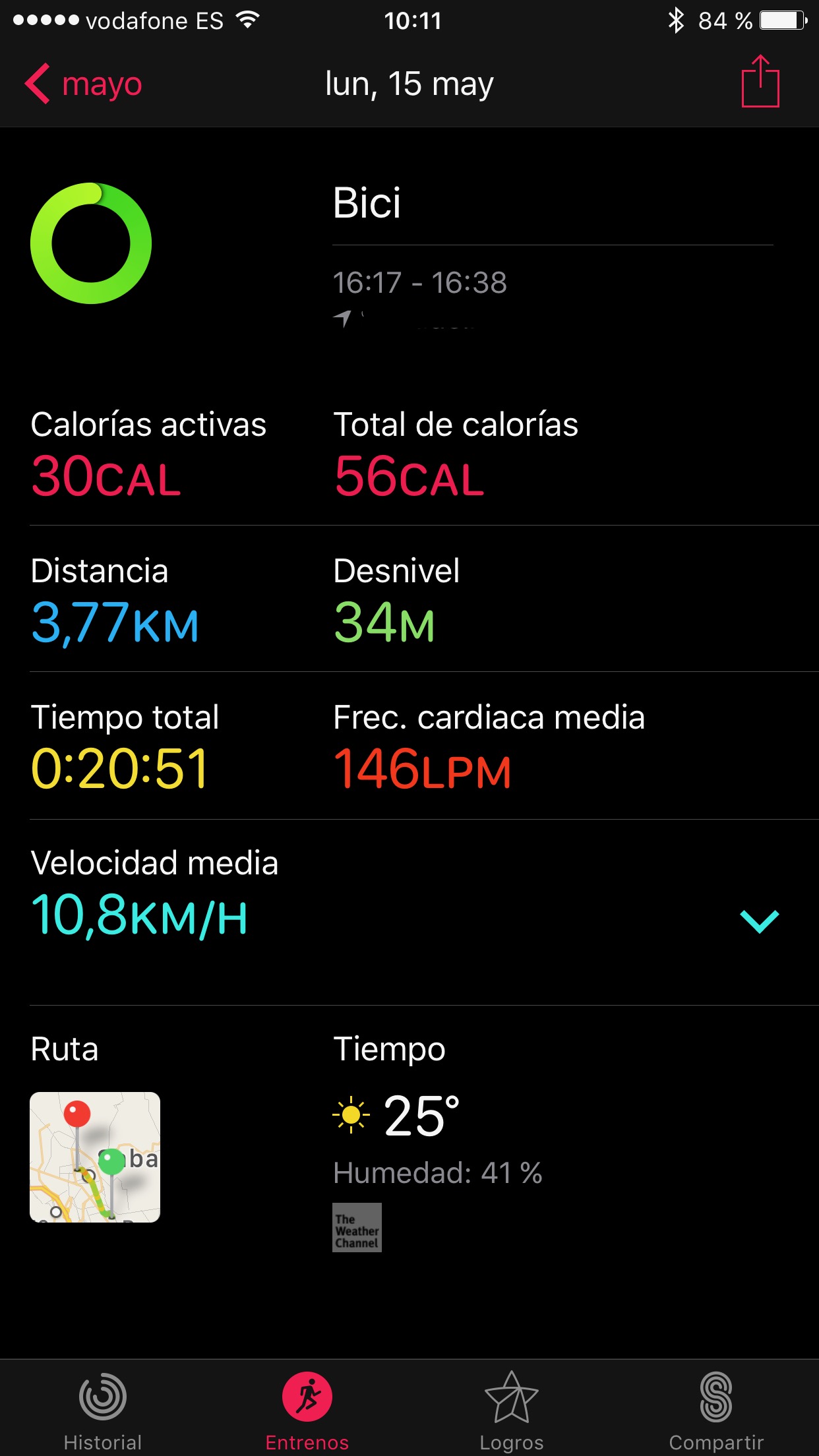 Podrás ver la ruta una vez que guardes el entreno. Abre la app Actividad, pulsa en la pestaña Entrenos y pulsa el entreno que has guardado. En la zona inferior verás la ruta y el desnivel que ha registrado el sistema.