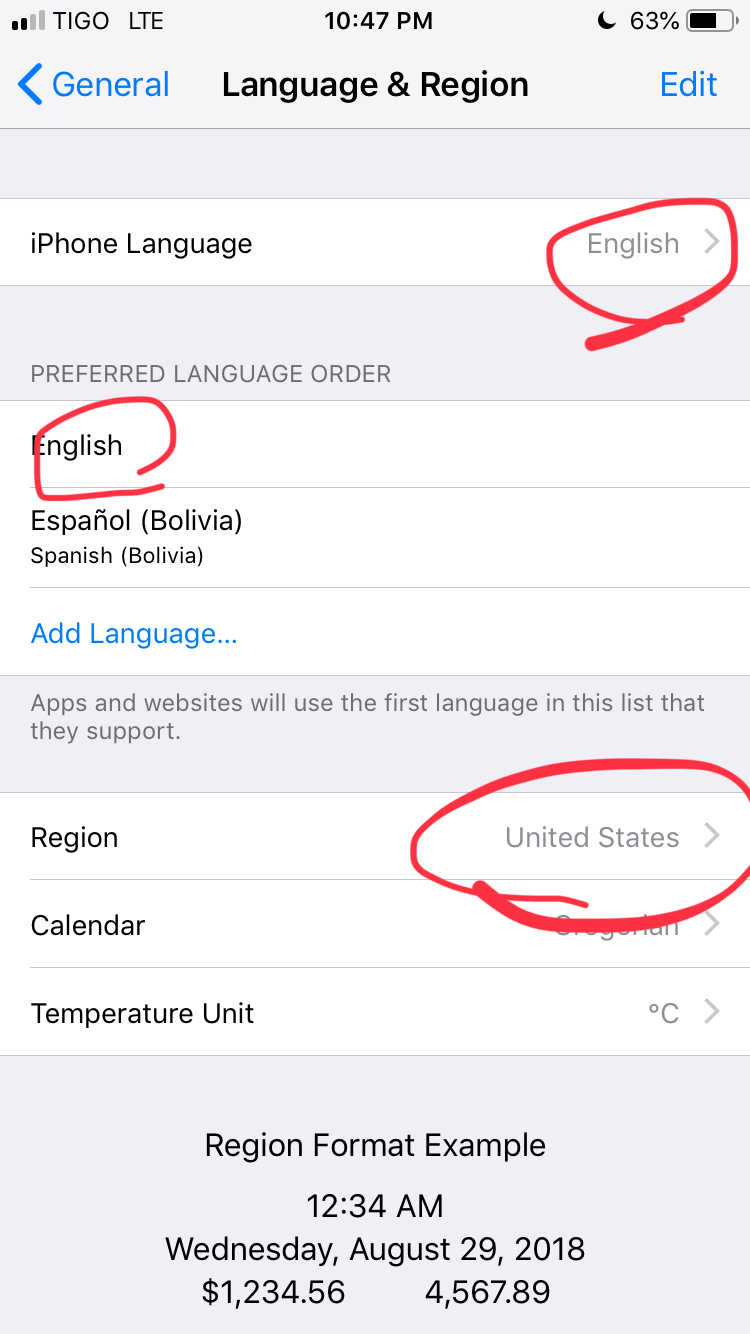 Primero cambia el idioma en CONFIGURACIÓN/ GENERAL/ Idioma del iPhone / a inglés de estados unidos y después cambia la Región a Estados Unidos.