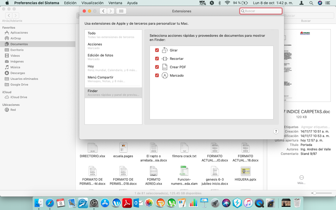 También puedes administrar Acciones rápidas. Haz clic en "Más Archivo cargado por el usuario " y, luego, elige "Personalizar". macOS Mojave incluye las 4 Acciones rápidas estándar, pero aquí también aparecen Acciones rápidas correspondientes a apps de distribuidores independientes. Más detalles en este enlace: