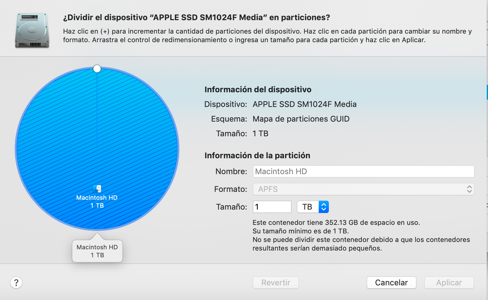 Tengo un Macbook Pro de 13" de late 2013. Tiene 1TB de SSD en el SSD original que compre a Apple y tiene libre alrededor de 700GB. Estoy tratando de crear particiones con la utilidad de disco o con el asistente de bootcamp para instalar Windows 10 pero no de deja. Me salen los errores mostrados en las fotos. La maquina esta en Mac OS Mojave 10.14