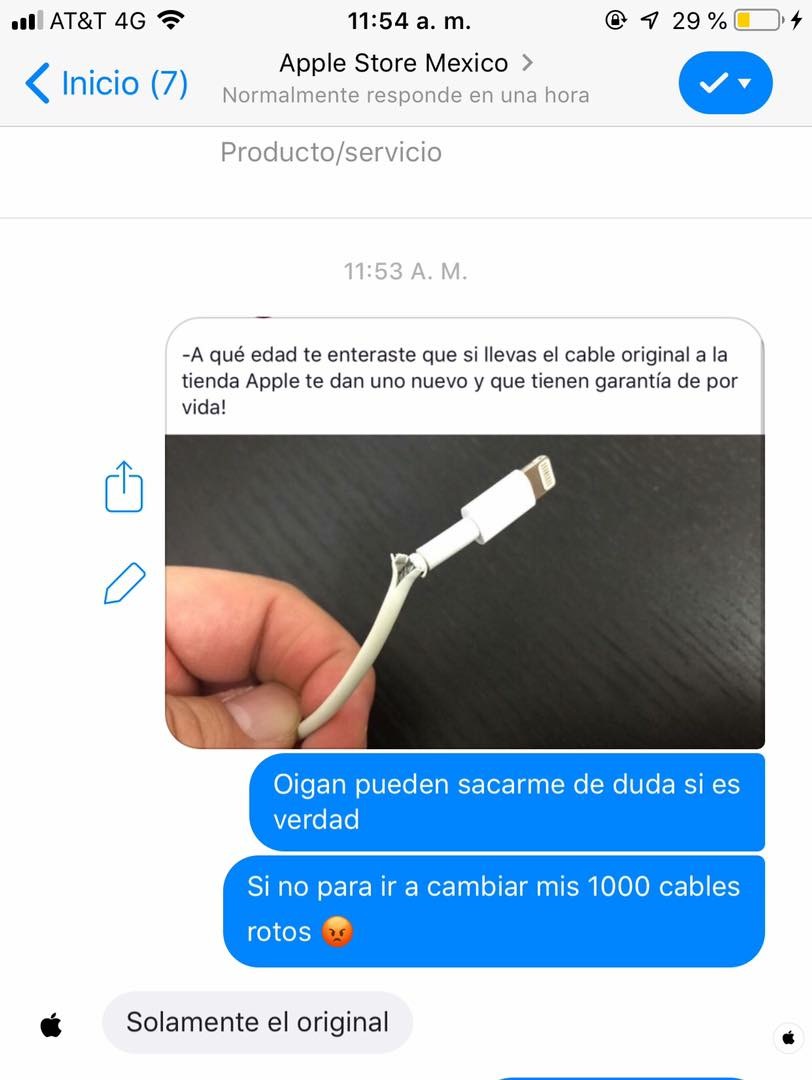 Por la foto que adjuntas, entiendo que has estado en contacto con el soporte técnico de Apple mediante la app Soporte Técnico. Si es así, entiendo que te habrán dicho que revisarán el cable, siempre que sea original de Apple, y te darán un diagnóstico y una solución. Debe ser un técnico quien revise el cable. Y también cabe decir que los daños estéticos, o los provocados por un mal uso, no están cubiertos por la garantía.