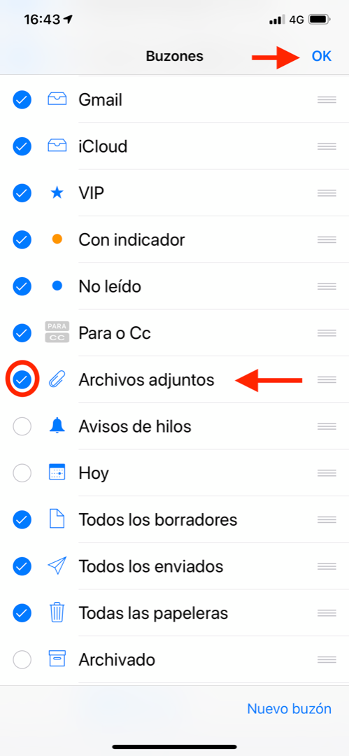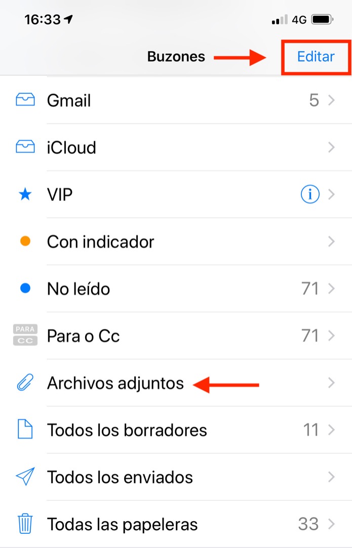 Pulsa arriba en Editar y comprueba si el buzón Archivos adjuntos está activado