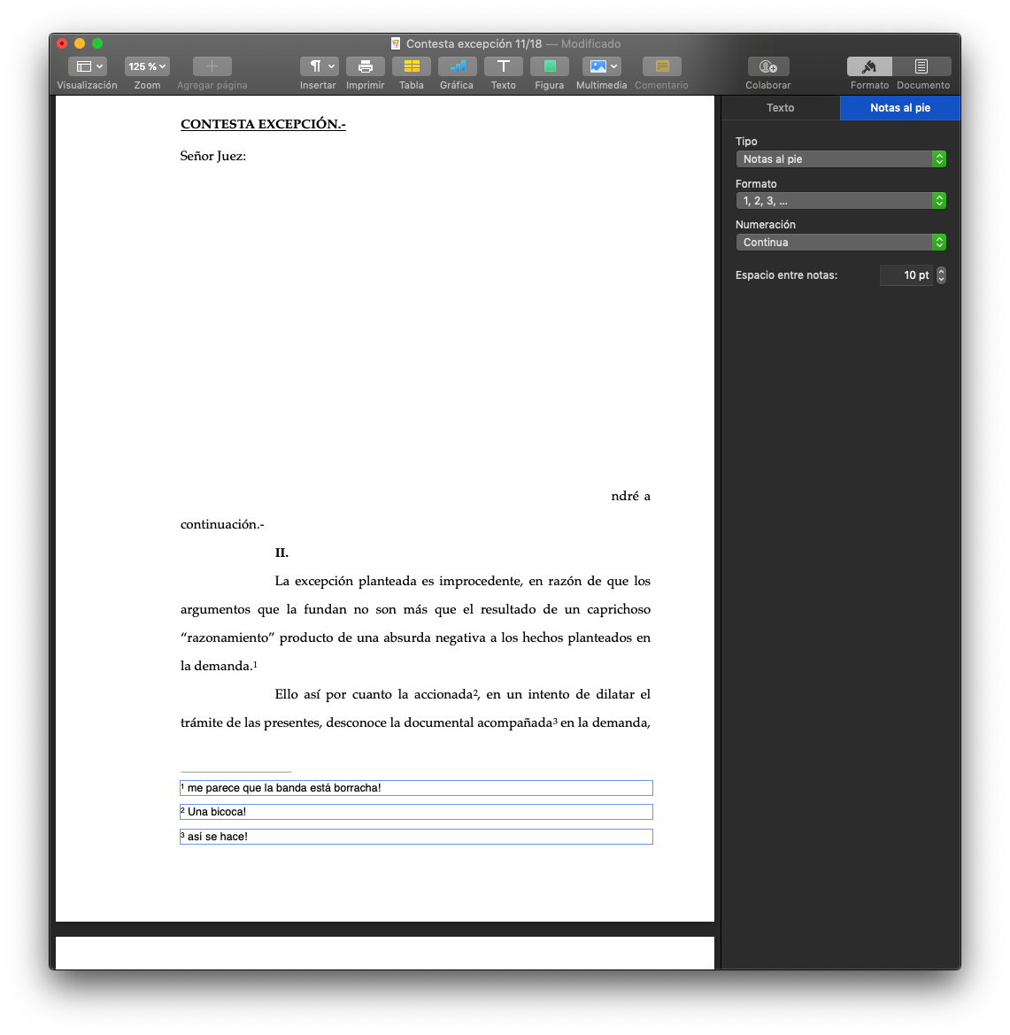 Muchas gracias por tu rápida y detallada repuesta, pero parece que no pude formular mi pregunta de manera suficientemente precisa. Mi pregunta es cómo eliminar el espacio entre varias notas a pie de página que aparecen en una misma página de modo que no quede ninguna línea vacía o espacio vacío entre dos o más notas a pie de página de una misma página. Parece que PAGES introduce por defecto un espacio (o una línea en blanco) después de cada nota a pie de página, de modo que entre una nota al pie y la siguiente nota al pie de una misma página hay un espacio en blanco. Debo eliminar ese espacio en blanco entre notas o regresar a Microsoft Word. En textos académicos o de investigación se usan muchas notas a pie de página y entre ellas no debe haber ningún espacio vacío (se perdería innecesariamente valioso espacio en el documento).