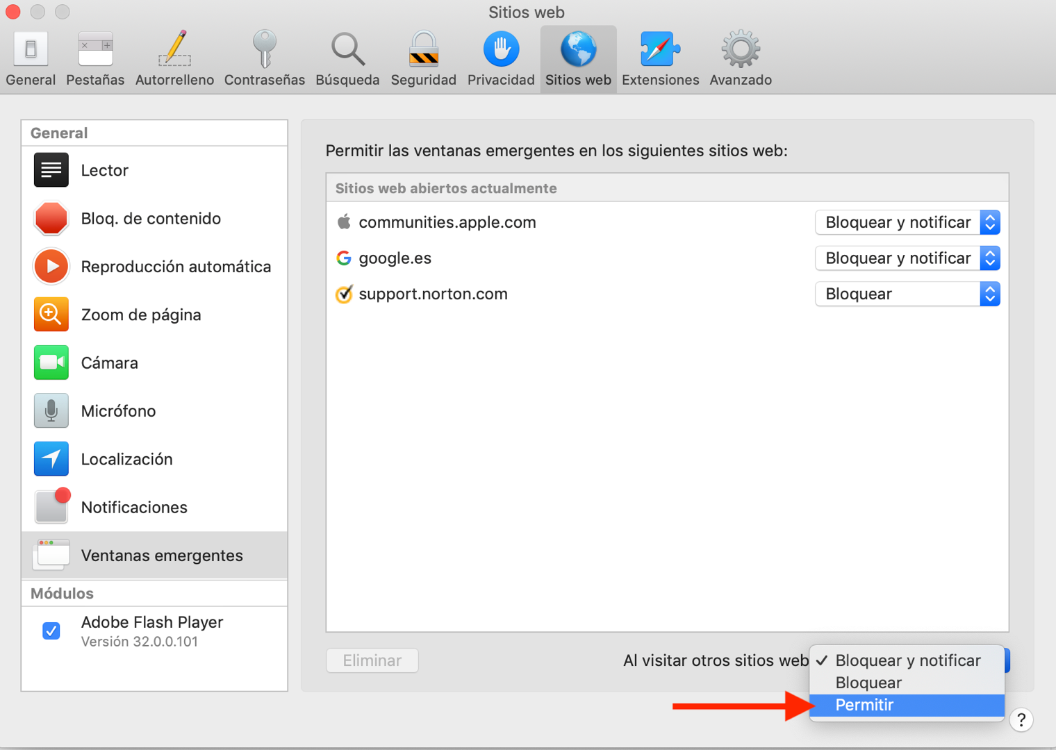 Entro dentro del menú de preferencias de Safari, Seguridad, pero no me aparece la opción para tildar bloqueo, desbloqueo de popups.