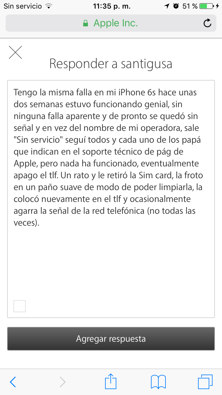Lei en varios foros que es un problema bastante comun en iPhone, y de distintos modelos. El mio es un 6S. Ya probe todo, absolutamente todas las recomendaciones de Apple, reiniciarlo de fabrica, hablar con mi proveedora de servicio, hasta me cambie de compañia! probe chips de otros paises, por ejemplo Mexico y figura SIN SERVICIO. No se que mas hacer.