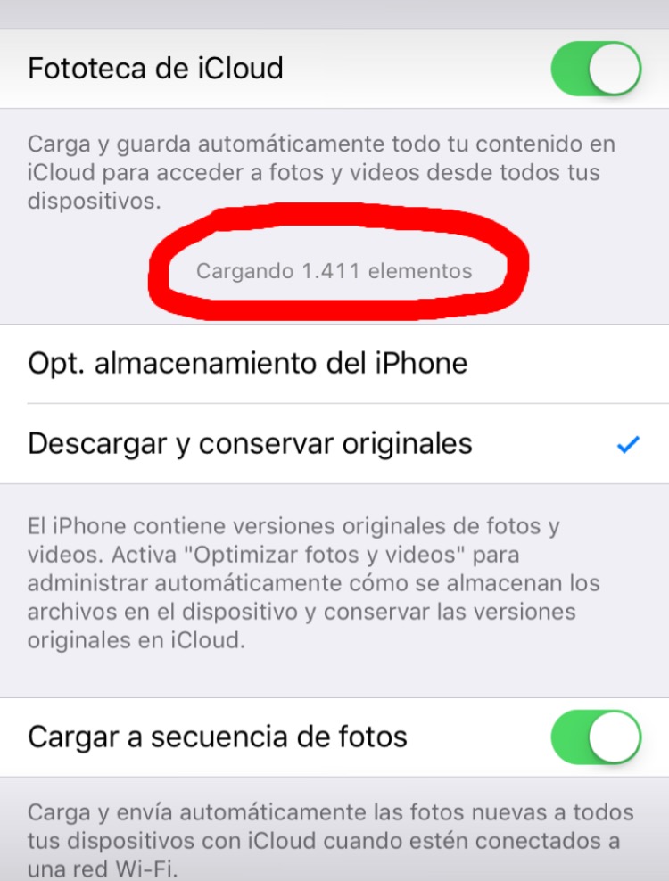 Lo raro es que hace días que ese número se mantiene igual, es decir que la carga no avanza, y cuando chequeo en icloud.com no es que se cargaron hasta cierta fecha (en ese sentido están actualizadas) sino que se cargaron algunas y otras no, como si al momento de realizar la copia el sistema se hubiera salteado varias fotos.