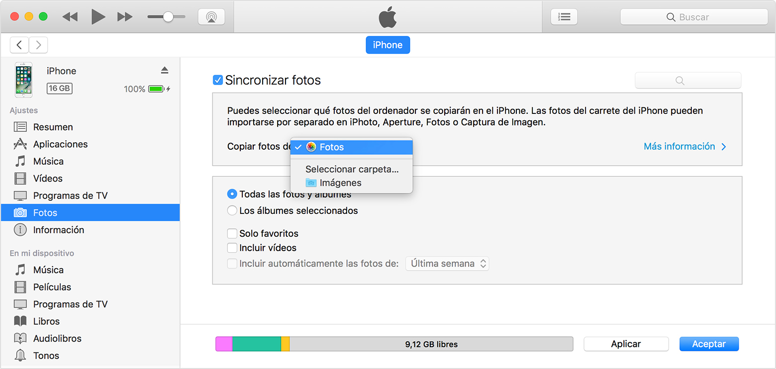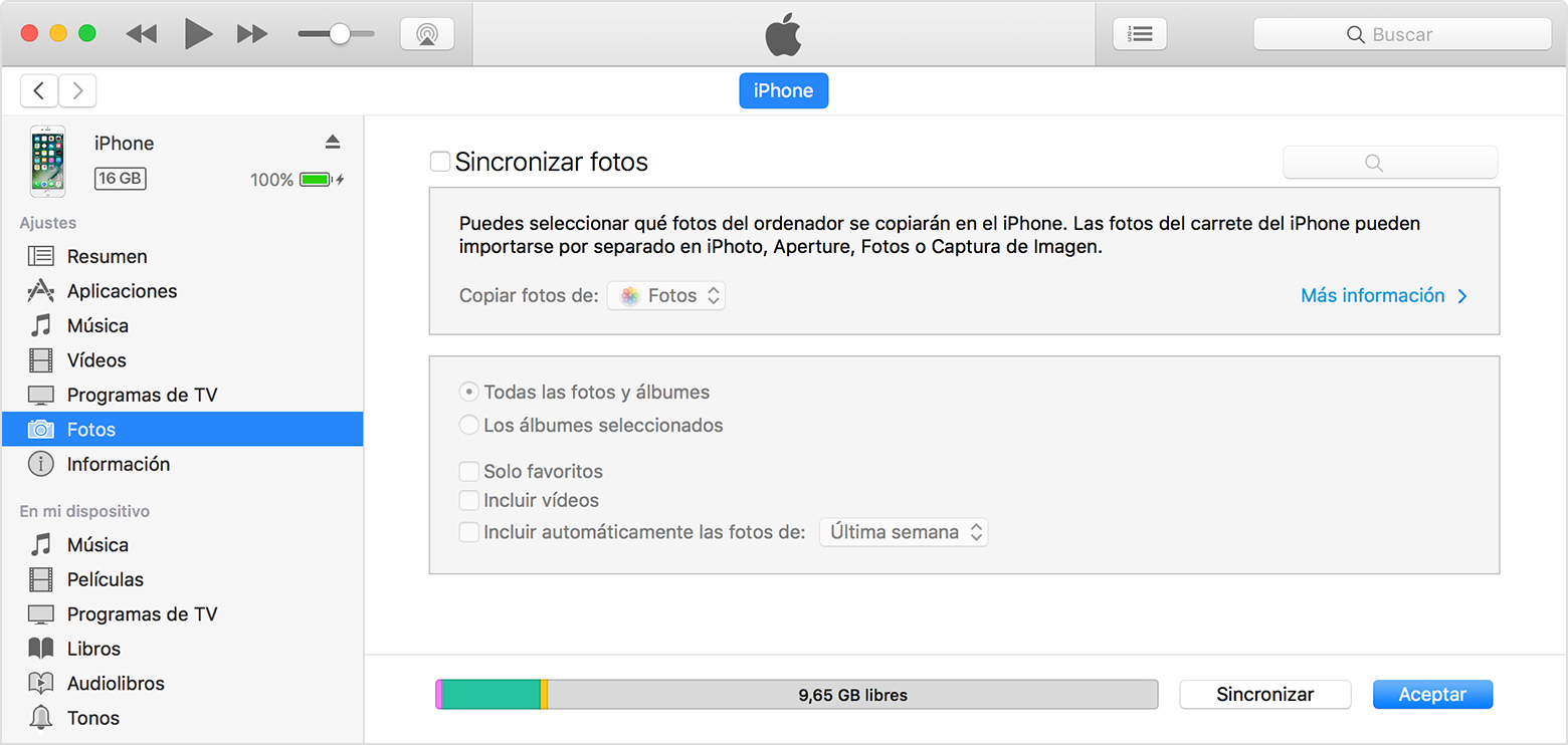 Si estás sincronizando desde Fotos, en iTunes solo está disponible la Fototeca del sistema.