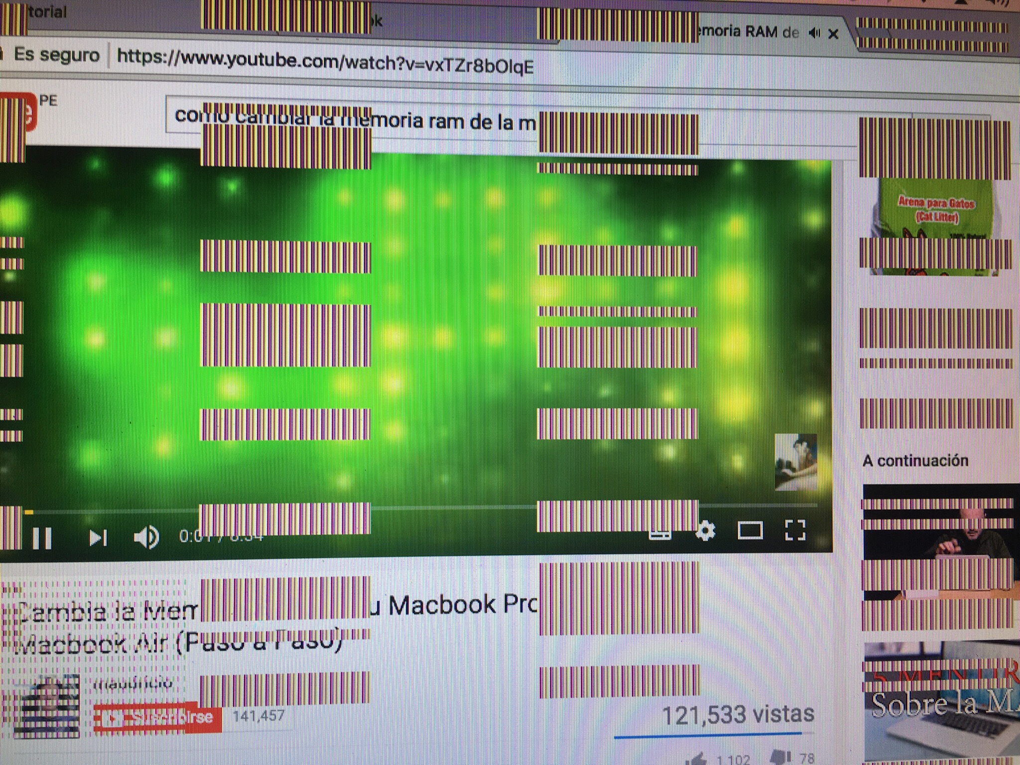 Aparecen rayas en la pantalla de mi Mac similares a unos códigos de barras luego de esto la Mac se reinicia para a veces completa el proceso a veces no, pero cuando intento reiniciarlo yo suena tres veces un pitido con la pantalla en *****
