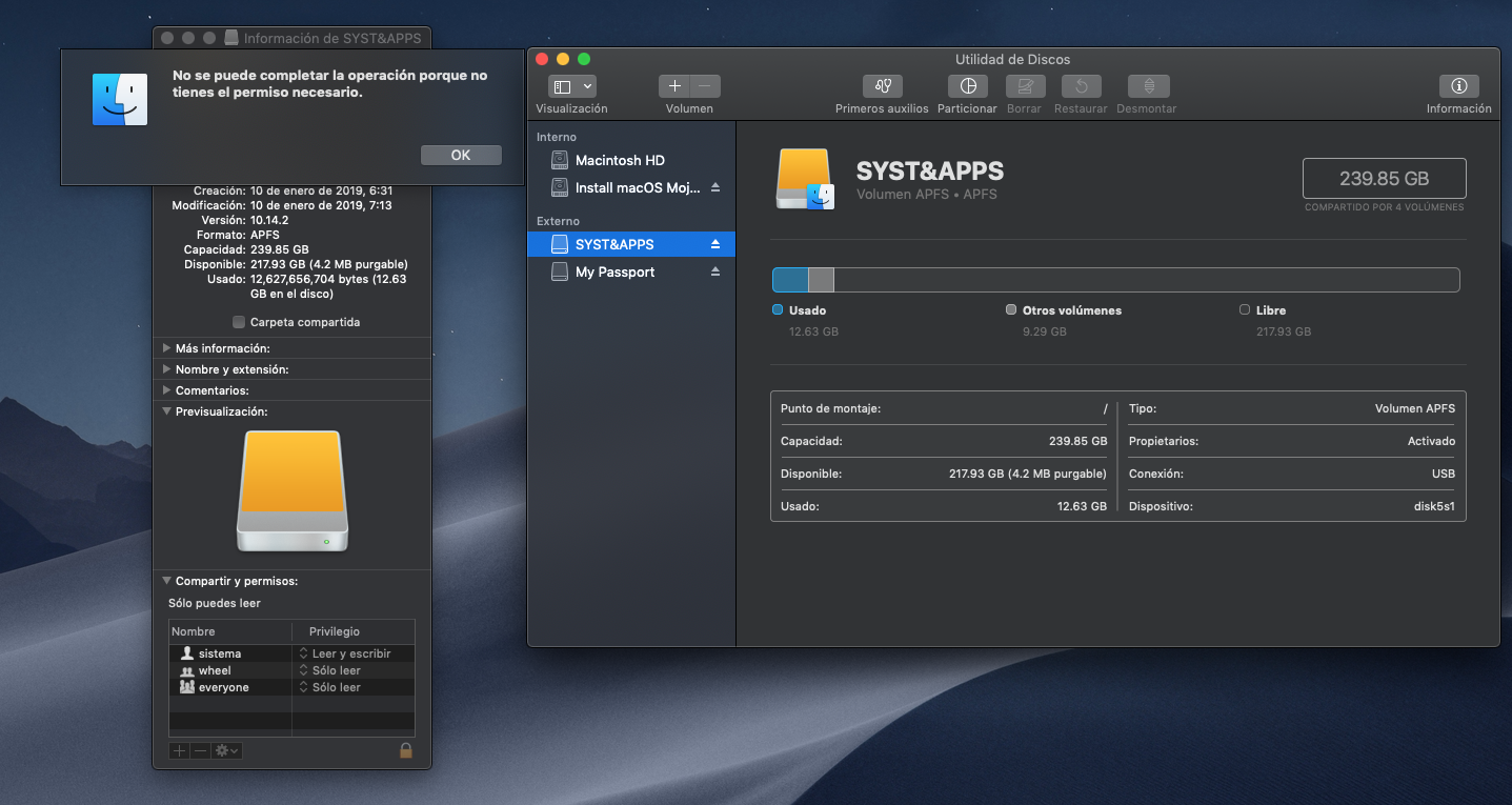 No puedo dar permisos de escritura SSD con sistema Mojave