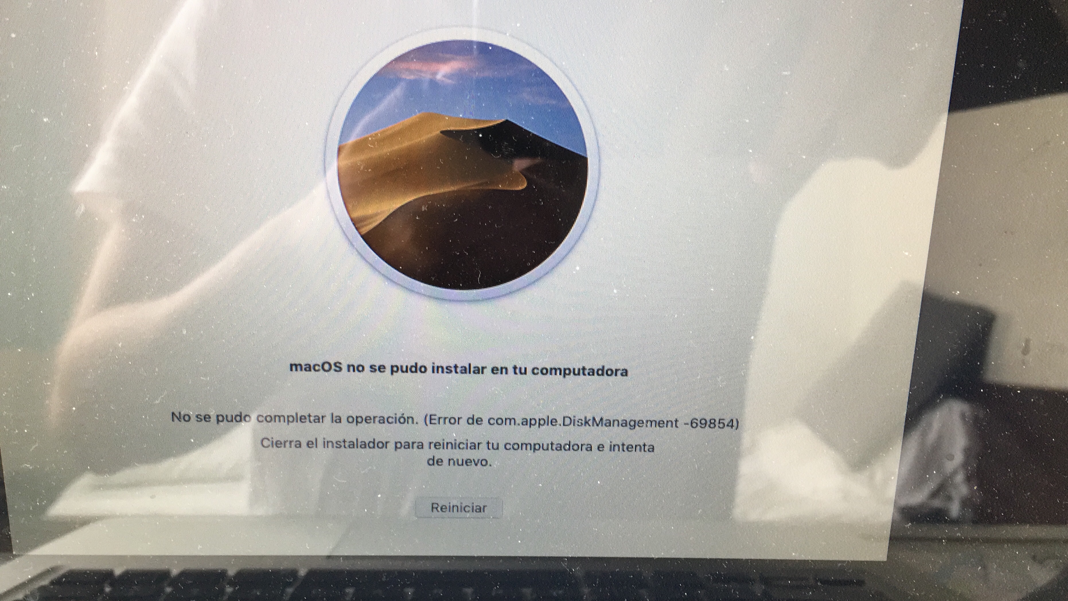 Hola, intenté hacer la descarga de la neva actualización de OS en mi MacBook Pro de segunda generación y en la mitad del proceso aparece una ventana en la que dice que no se pudo completar la operación. (Error de com.apple.DiskManagement -69854)