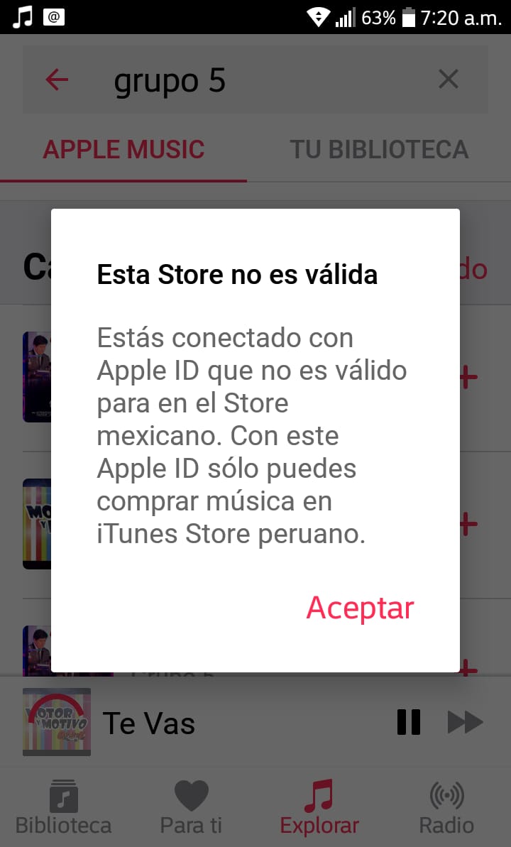 Entiendo que hace unos días buscaste música desde tu dispositivo Android que no estaba disponible en la tienda de iTunes en Perú pero solamente en México. Aparentemente un cambio ha sido efectuado y ahora no te deja escuchar la música que ya tenías en tu cuenta de Apple Music.