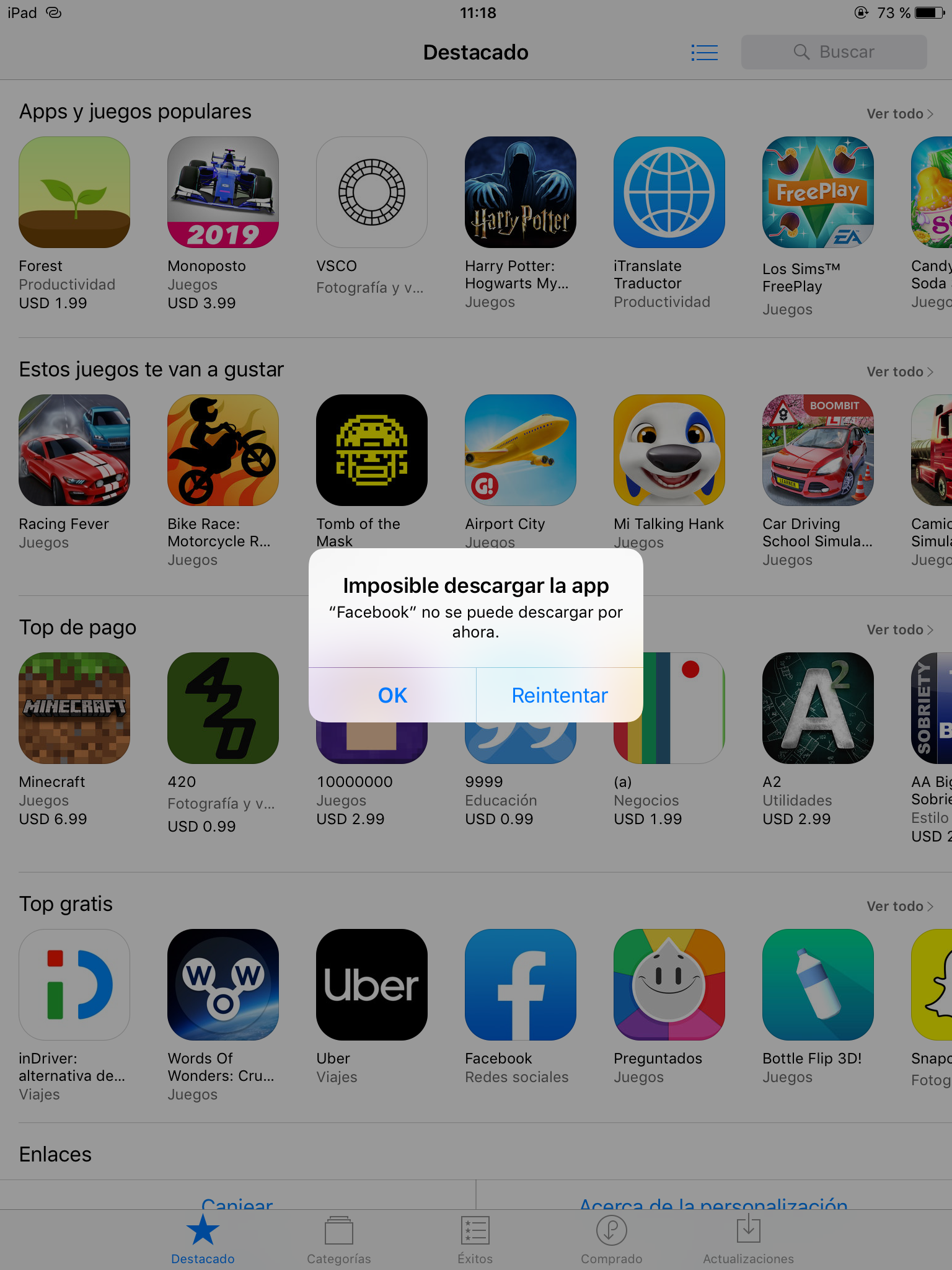 Desde el día de ayer mi iPad no me deja descargar ninguna app, solo me sale una ventana diciendo i,posible descargar la app en este momento, ya lo he intentado todo para resolverlo pero igual no me deja!!!