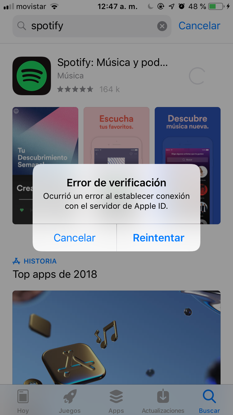 Asegúrate que tienes iniciada sesión correctamente en al App Store. Lo podrás ver en los Ajustes del dispositivo, iTunes Store y App Store, tu ID. Si tu ID aparece en color azul, púlsalo y selecciona cerrar sesión. Apaga el iPhone, enciéndelo pasados un par de minutos y vuelve a iniciar sesión en el iTunes Store y Apps Store, en los Ajustes del dispositivo, iTunes Store y App Store.