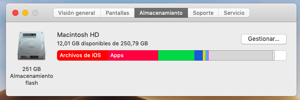 Buenas, ¿alguien sabría decirme como borrar "archivos iOS y apps"? Me aparece como almacenamiento lleno y apenas tengo archivos guardados en el mac. Adjunto foto de como aparece mi almacenamiento. Gracias!