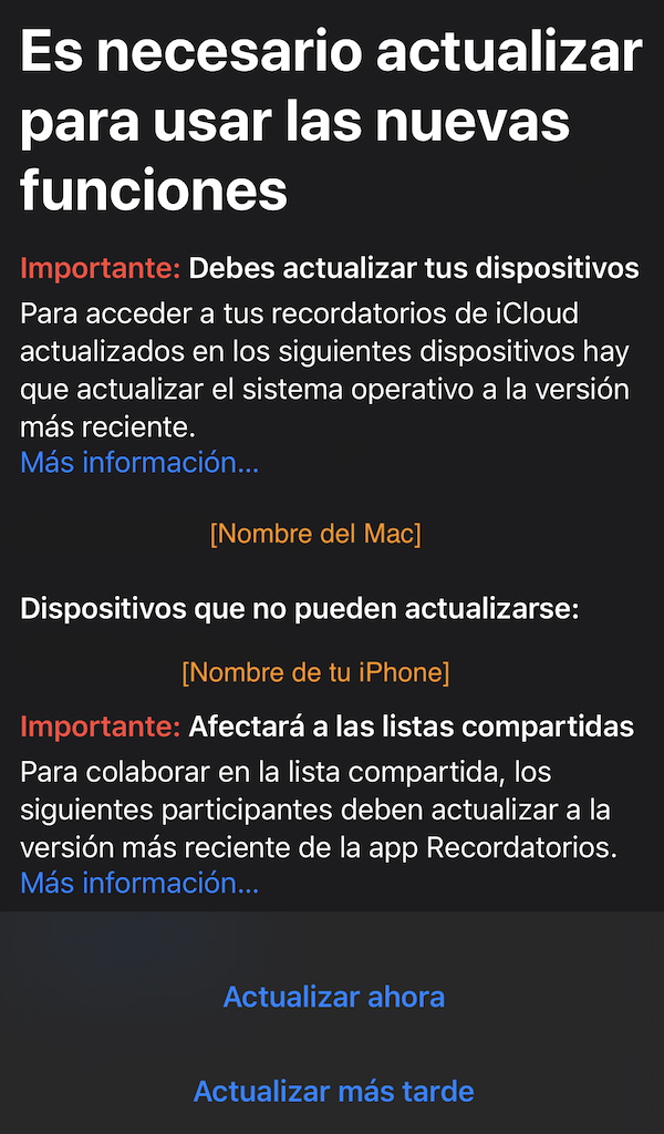 De momento Recordatorios será compatible con iOS 13 cuando este disponible macOS Catalina [aún sin fecha de salida] solo sabemos que sale para Otoño, entonces lo más conveniente sería pulsar [Actualizar más tarde] porque de momento no sincronizará ni actualizara nada.
