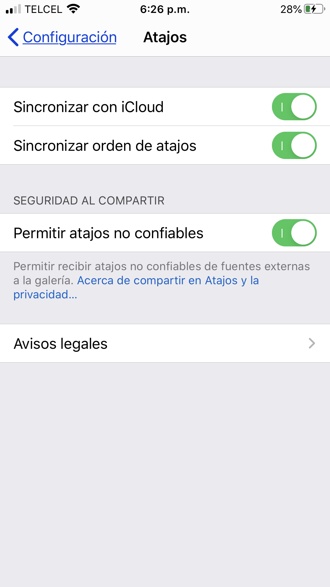 Acabo de comprar el iPhone 11 Pro y en el apartado de Configuración de Atajos no se encuentra lo opción de activar los atajos no confiables. ¿En qué apartado encuentro la opción para activarlos? Debido a que quiero activar atajos de otros amigos y no me lo permite ☹️