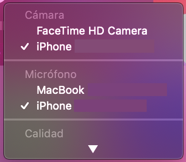 Por defecto nos saldrá seleccionada la cámara del Mac, lo que haremos es darle a la pestaña 🔽 de al lado del botón de grabación.