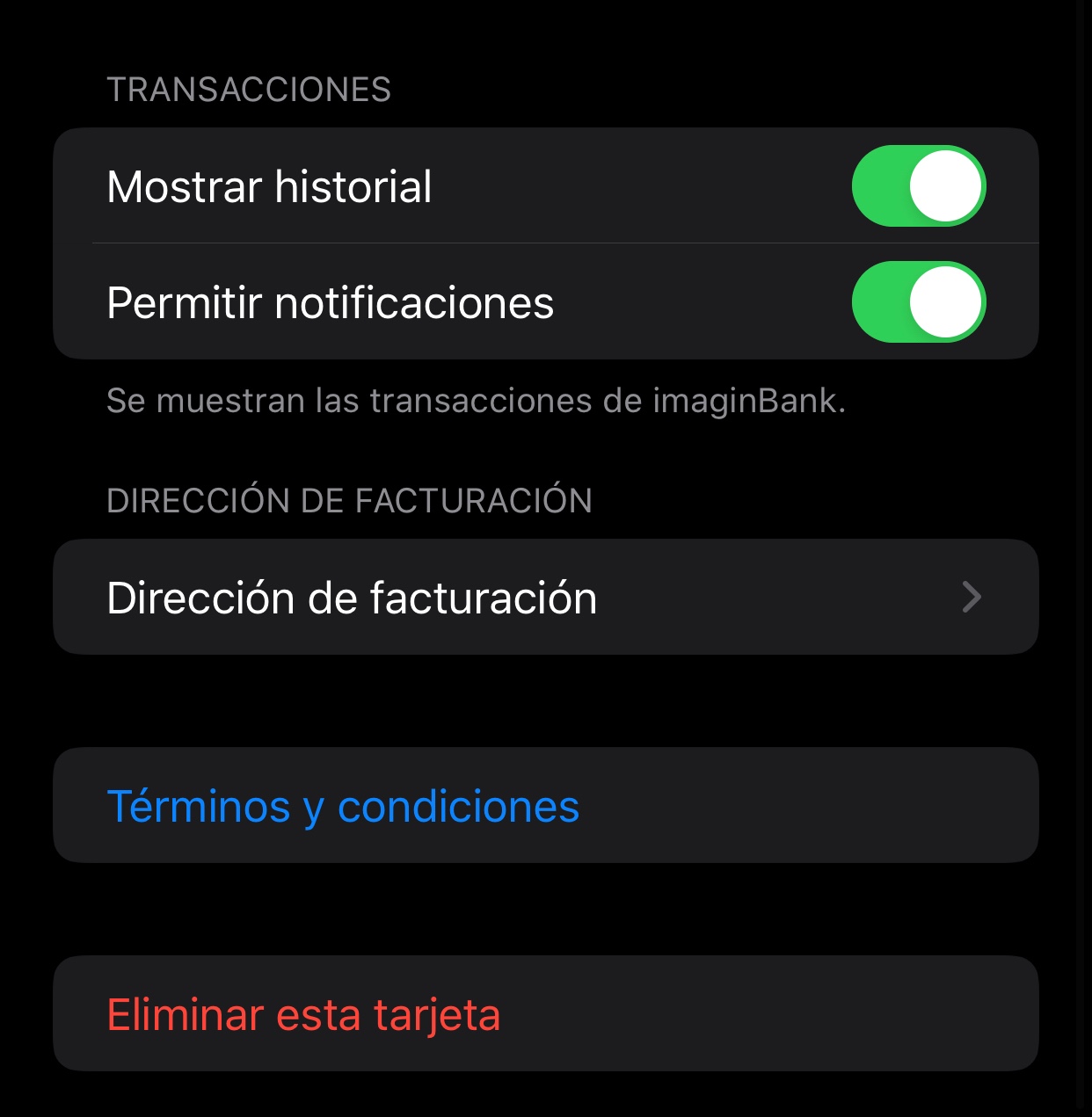 Aquí podrás apagar la opción de ver tu historial reciente en Transacciones. Esta opcion es individual por cada tarjeta en tu Wallet.