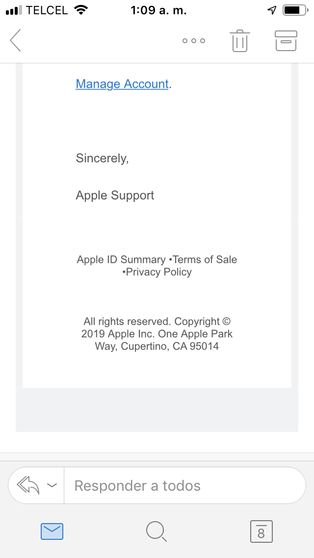 Si identificas que el correo no es de Apple, no pulses en ningún enlace y marca la dirección como correo no deseado.