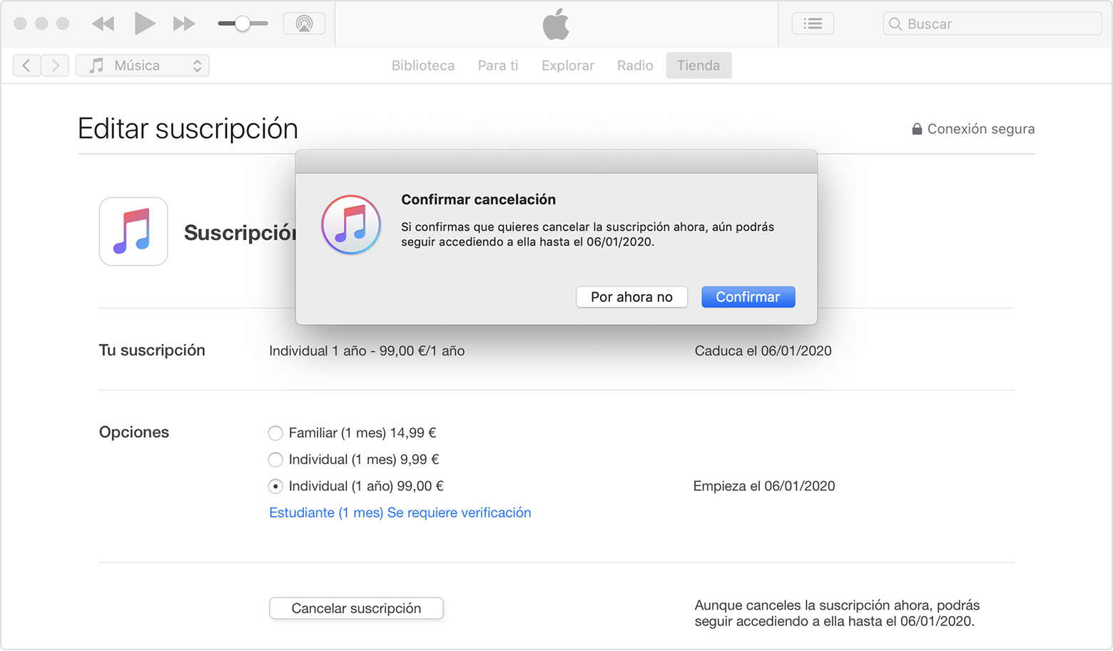 Si usas el Mac o PC en el cual te registraste para Apple Music, pulsa este enlace: Ver mi suscripción. O sigue estos pasos:
