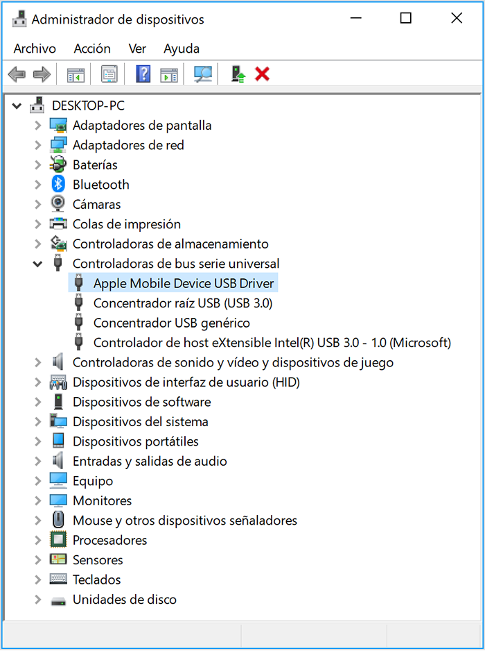 Comprueba en Administrador de dispositivos si el controlador Apple Mobile Device USB está instalado. Sigue estos pasos para abrir el Administrador de dispositivos: