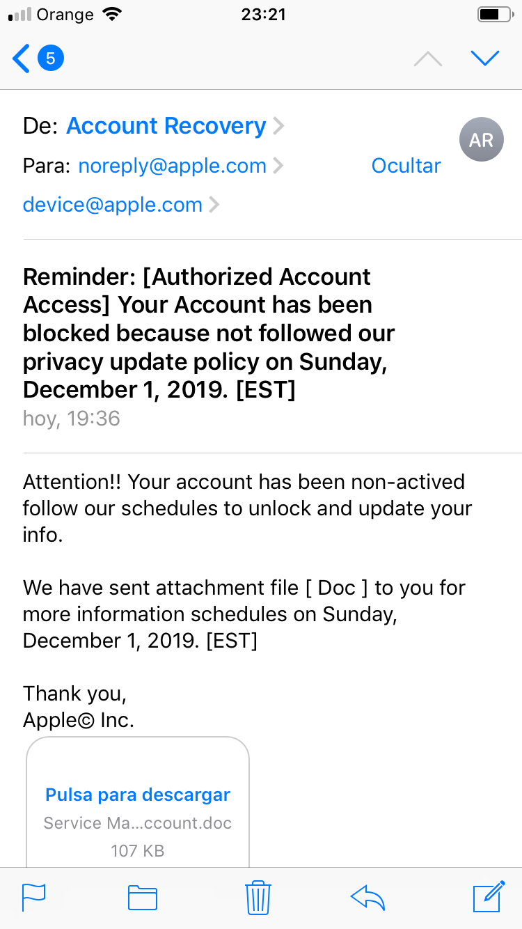 He recibido un email sospechoso de account recovery con un archivo adjunto raro...