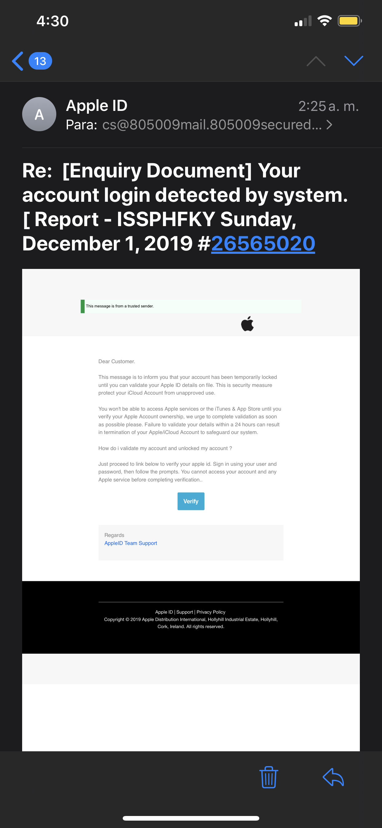 Me llega un correo de Apple pidiendo verificar mi cuenta de Apple con un link