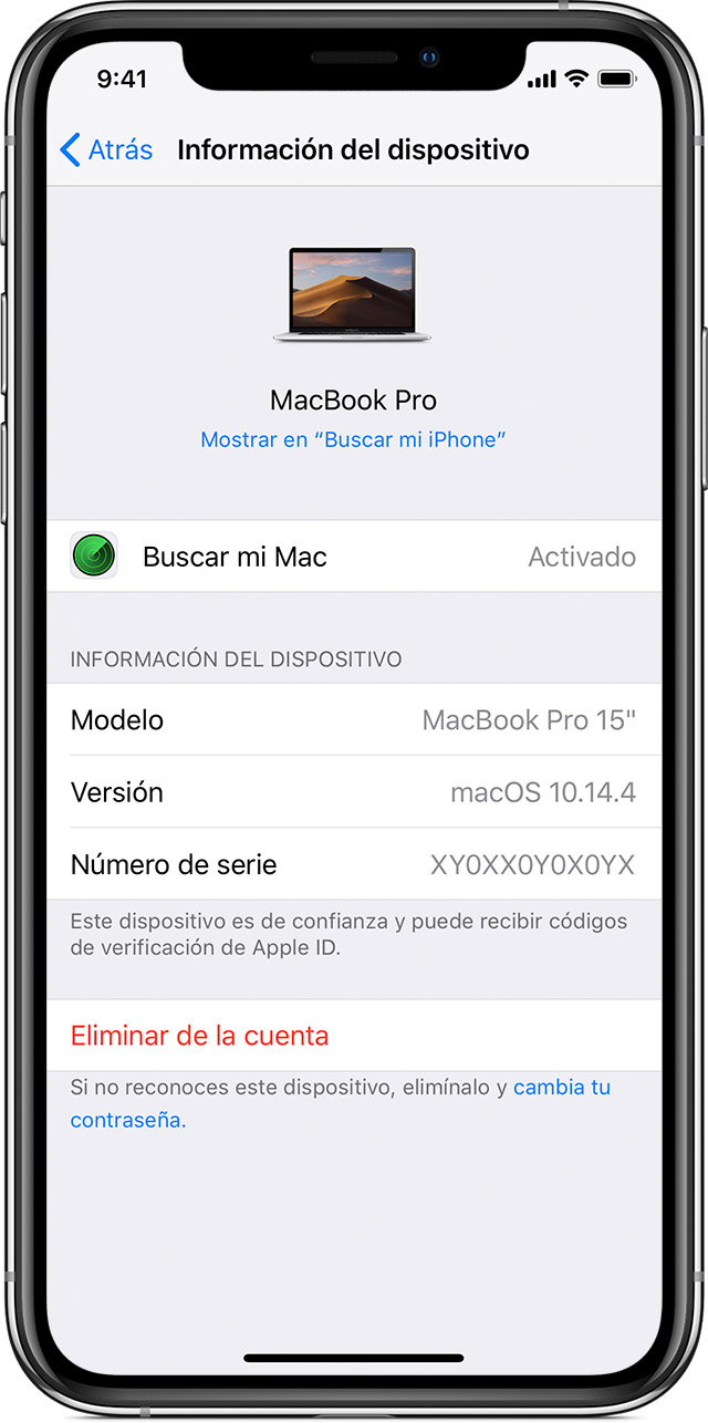 Si configuras la autenticación de dos factores para tu Apple ID, eliminar un dispositivo asegurará que este ya no muestre códigos de verificación y no pueda acceder a iCloud ni a otros servicios de Apple, incluido Buscar mi iPhone, hasta que vuelvas a iniciar sesión con la autenticación de dos factores. El dispositivo no aparecerá en la lista a menos que vuelvas a iniciar sesión.