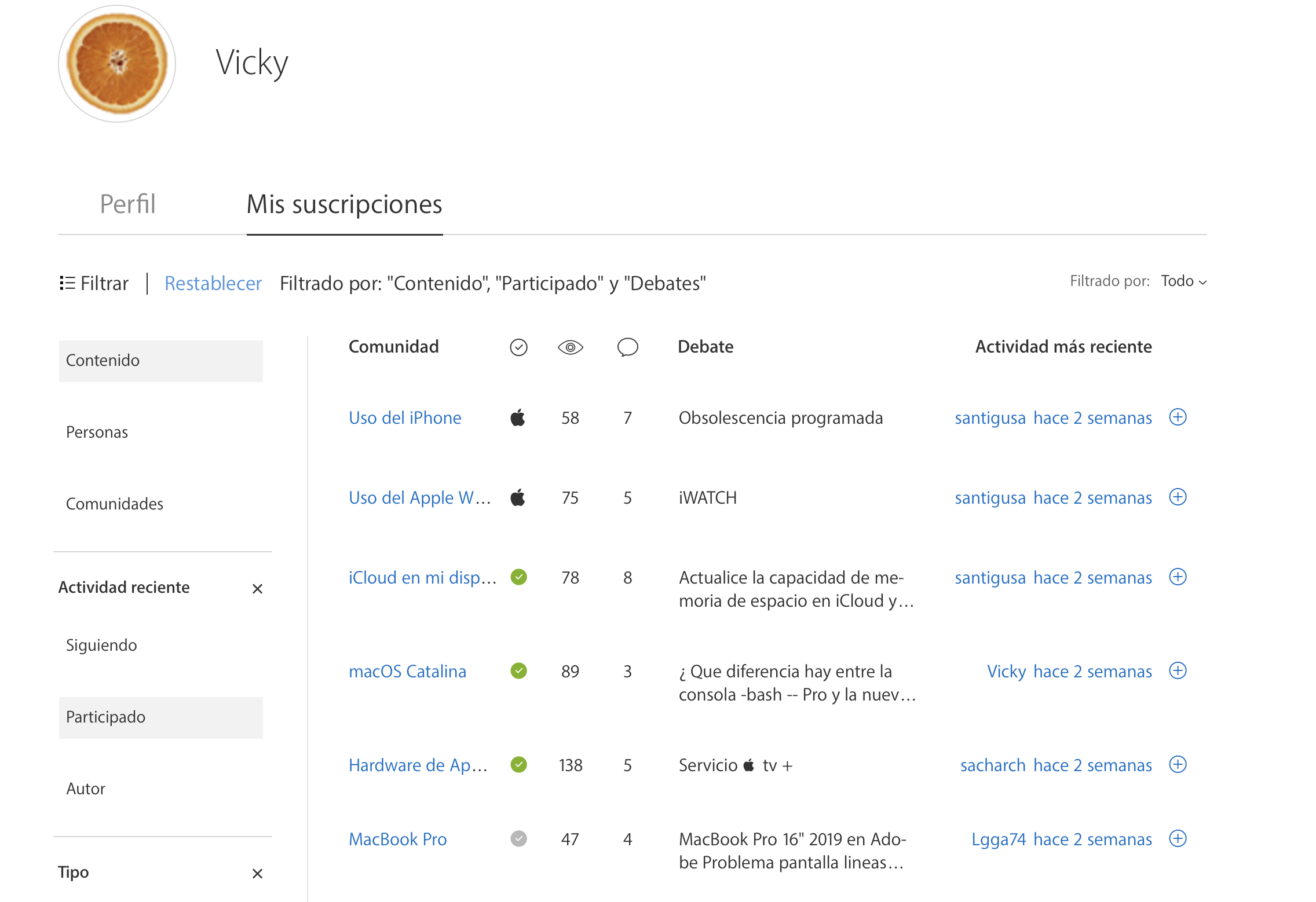Bienvenido a la Comunidad de Apple en español. Muchas gracias por tu interés y participación en la Comunidad de Apple. Hay varias maneras de mantenerte al tanto de los mensajes en los cuales has participado como contribuyente o autor.