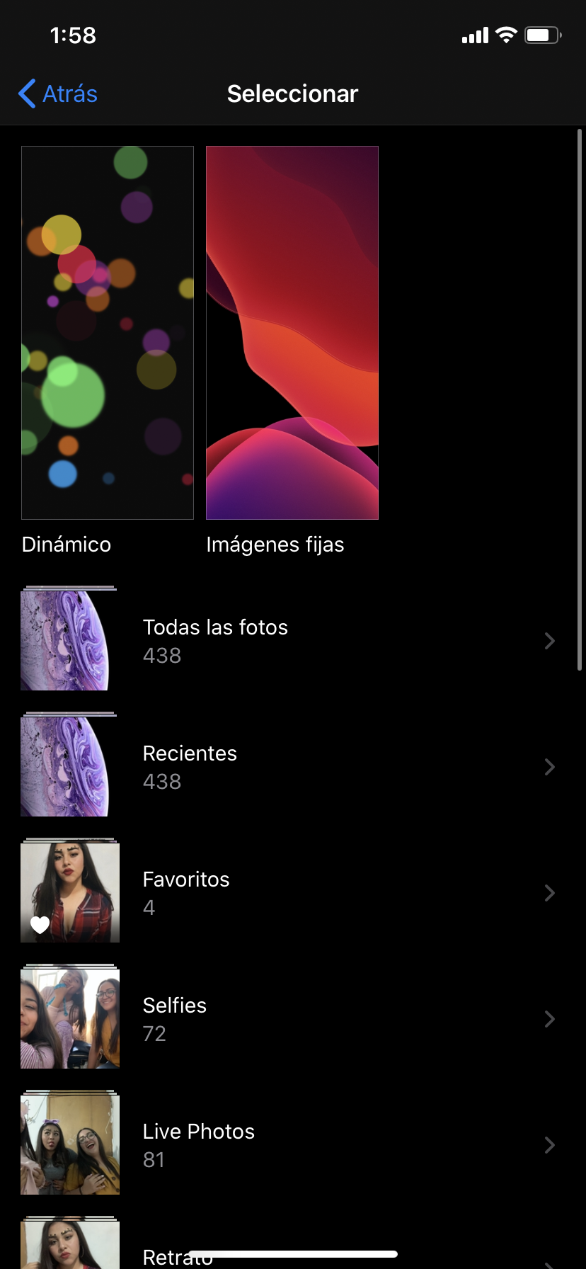 Elige una imagen en Dinámico, Imágenes fijas, Live o una de tus fotos. Los fondos de pantalla predeterminados cambian según la versión de iOS.