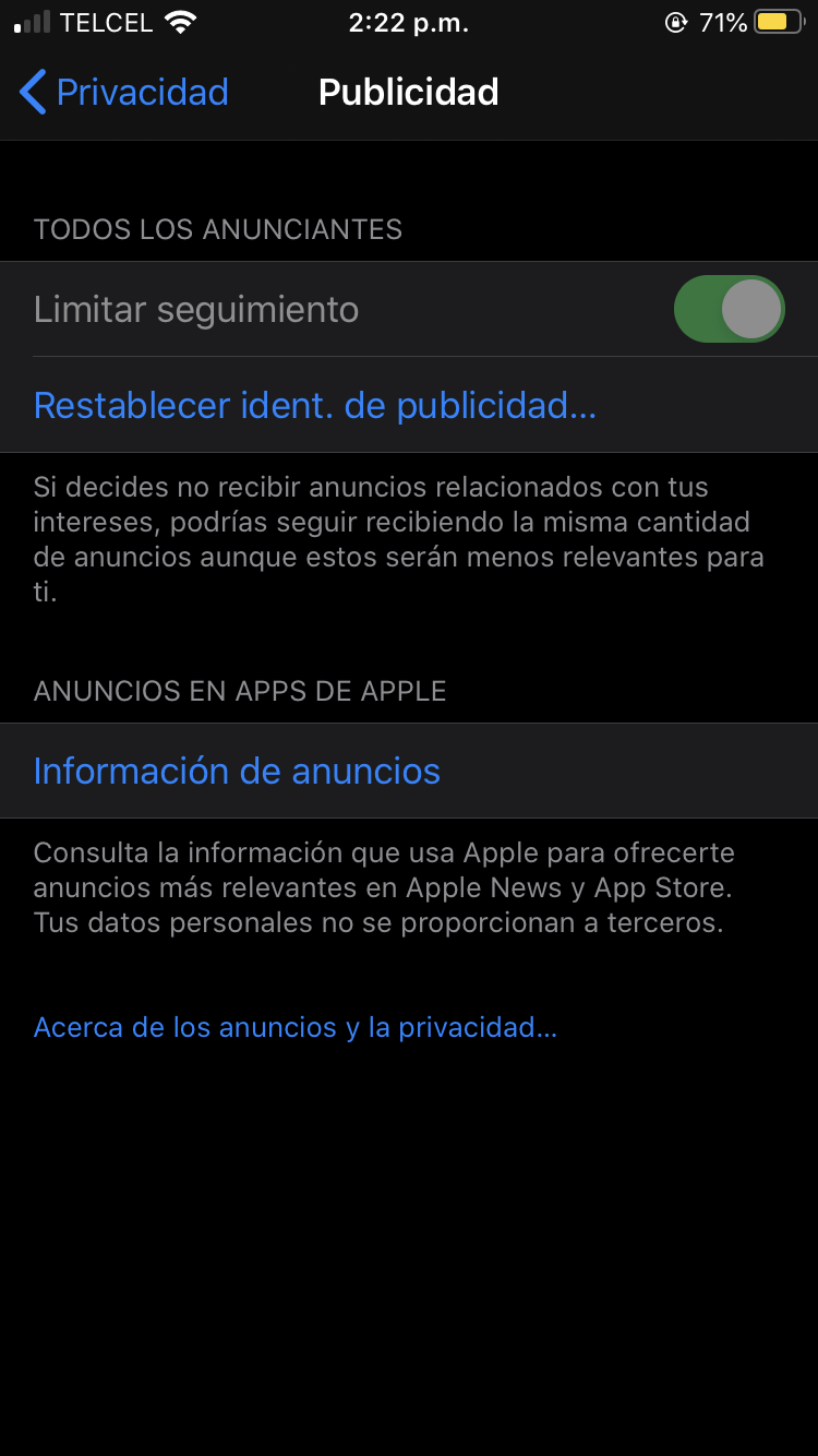 Prueba algunas opciones. Quizás la opción de Limitar seguimiento esté relacionada con otras opciones que hay en Ajustes, Privacidad, Localización, Servicios del sistema. Ahí, desactiva las opciones que tengan que ver con anuncios y similares, como Anuncios, avisos y sugerencias por ubicación, identificación de comerciantes, y Lugares importantes.