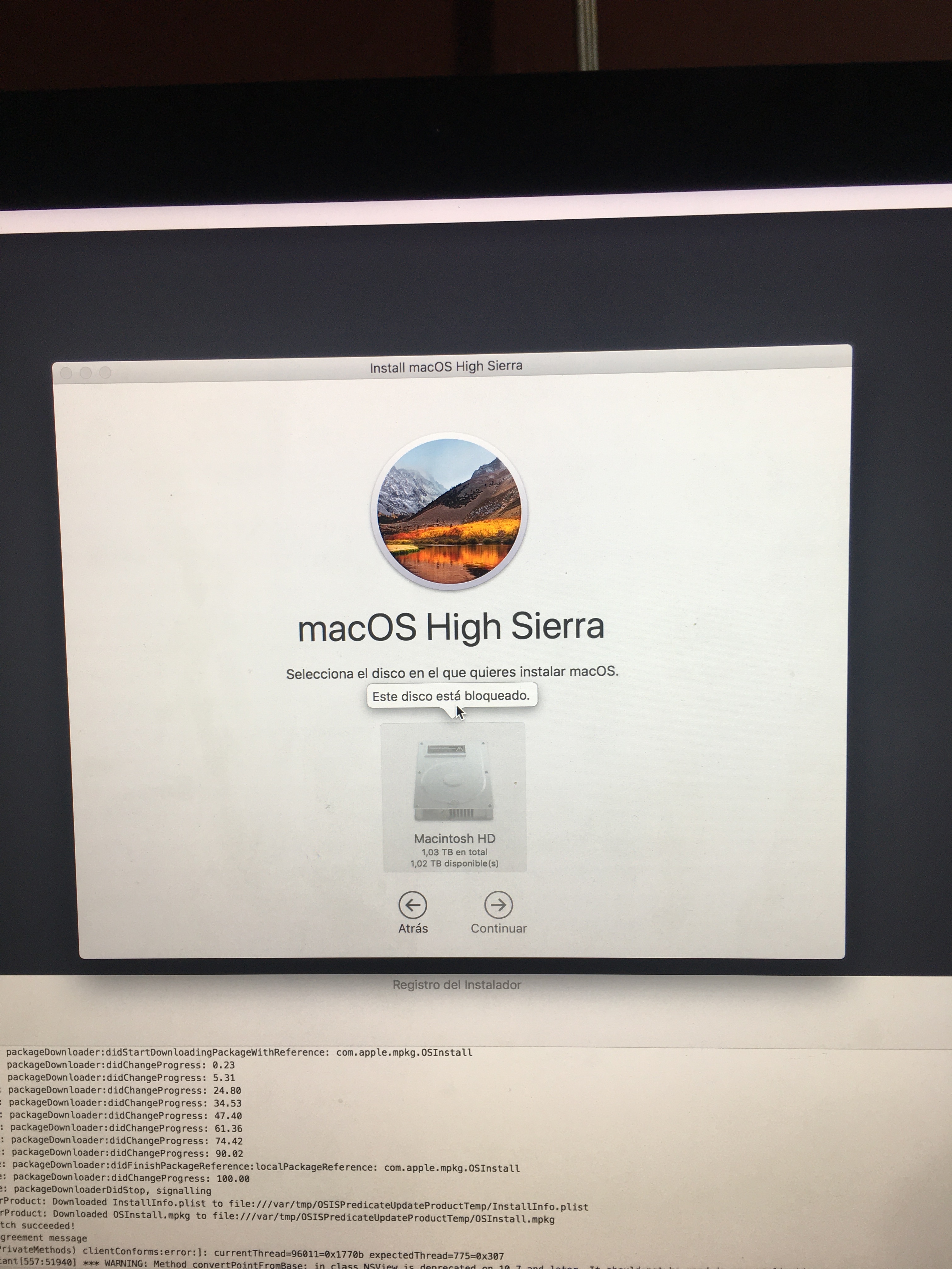 Quise reiniciar mi Mac y todo iba bien hasta el momento de seleccionar el disco duro para instalar el iOS HIGH SIERRA me aparece solo un disco duro Macintosh HD y está bloqueado no me deja continuar me podrían ayudar
