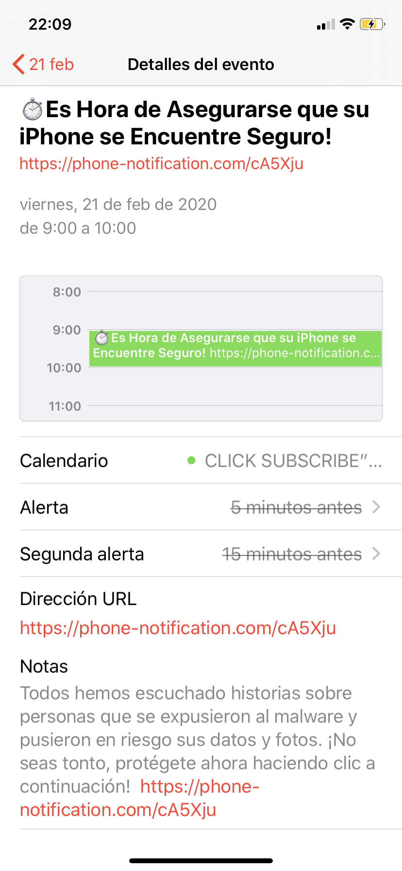 Conforme a lo indicado, pero falta el detalle de borrar la cuenta del calendario en Ajustes → Contraseñas y cuentas. Aparecera una cuenta desconocida "click subscribe" o similar. Entrando en esa cuenta, aparece la opción de "Eliminar Cuenta".
