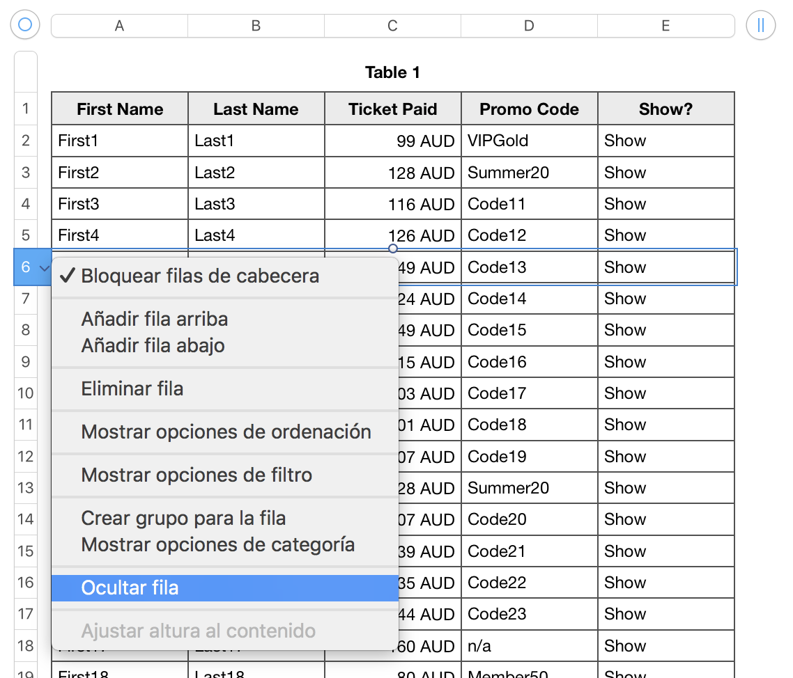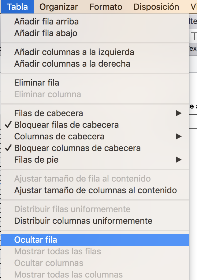 Por qué no me habilita la opción de "ocultar" una fila en numbers. No sé cómo se hace