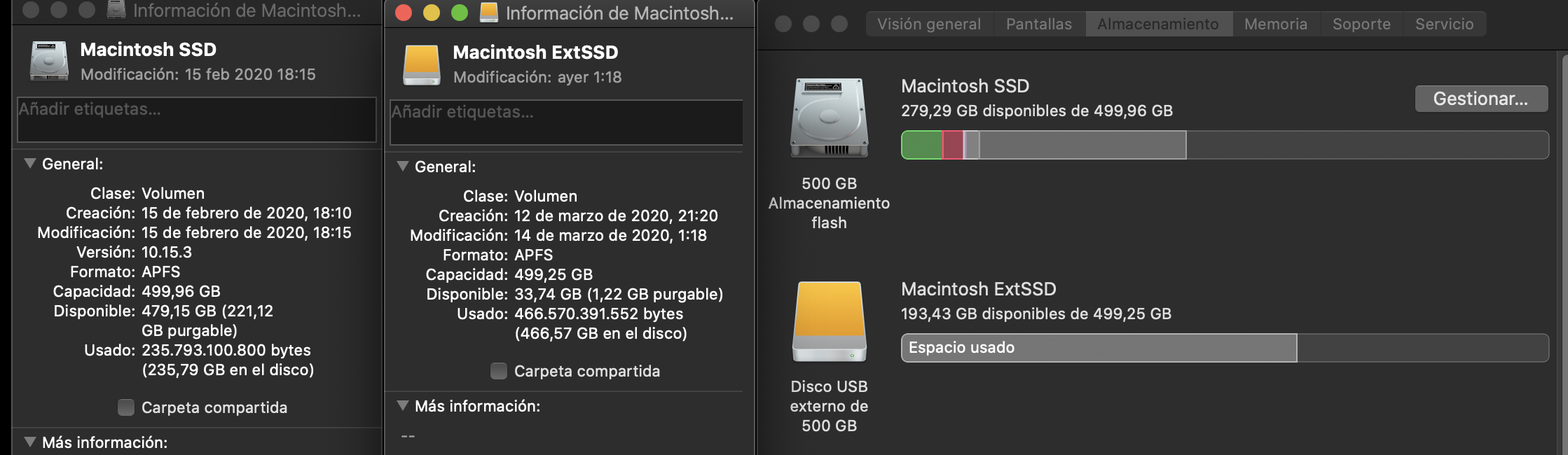 he notado que la información que se muestra sobre los discos es casi siempre errónea. En la imagen adjunta, a la izquierda, el SSD del sistema, formateado en APFS, muestra 500GB de capacidad, y 479GB disponibles, pero usados 235GB. El espacio disponible evidentemente no es real, el disco tiene realmente más de la mitad ocupado. Ni siquiera es correcta la suma Espacio total = Disponible + Usado. La información de almacenamiento que creo que sí es correcta es la que se obtiene en "Acerca de este Mac"-Almacenamiento, que es la parte de la derecha de la imagen.