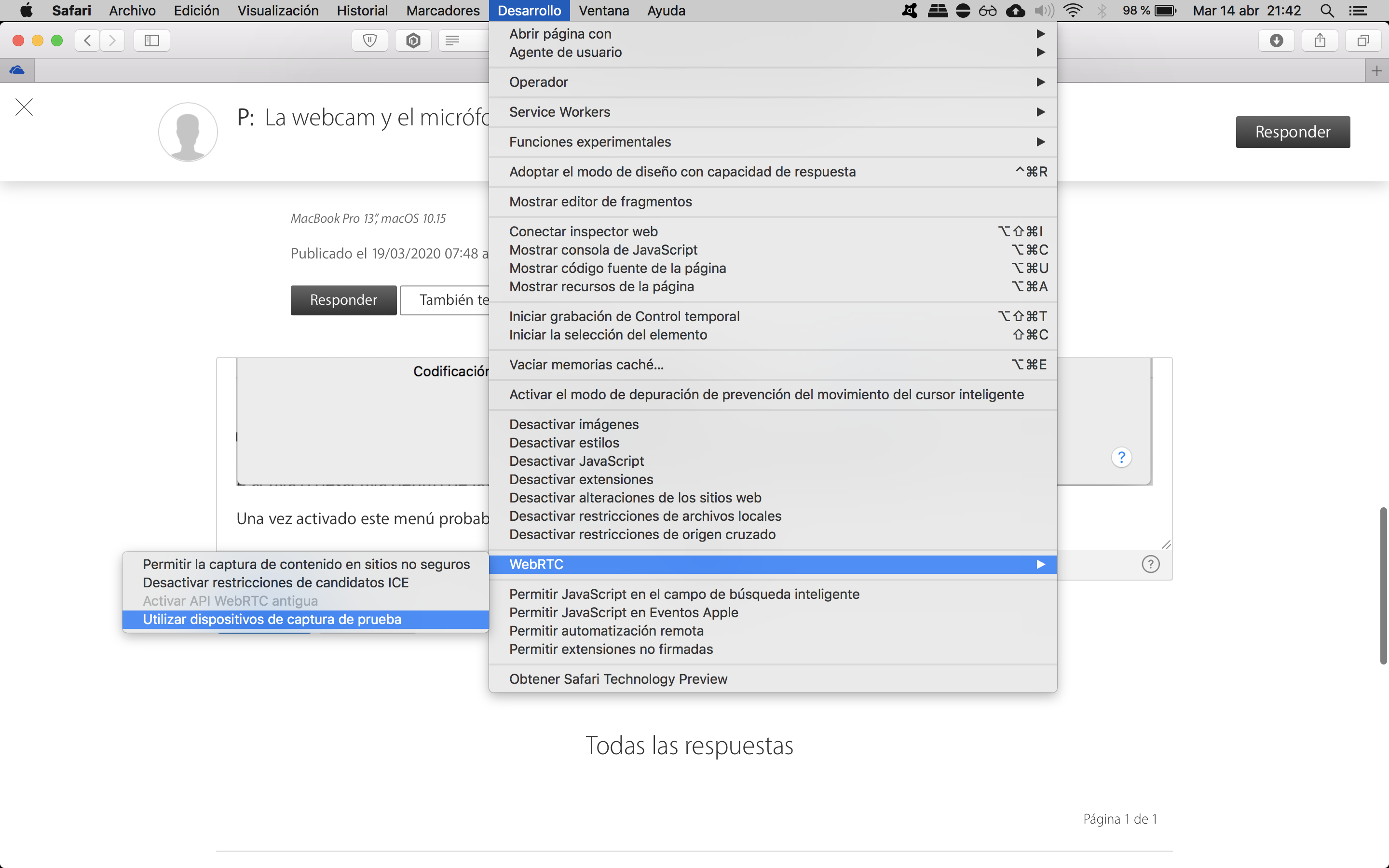 Desde hace ya bastante tiempo, no consigo que la webcam funcione en Safari. Tengo macOS Catalina 10.15.3 y Safari 13.0.5 (las últimas versiones).