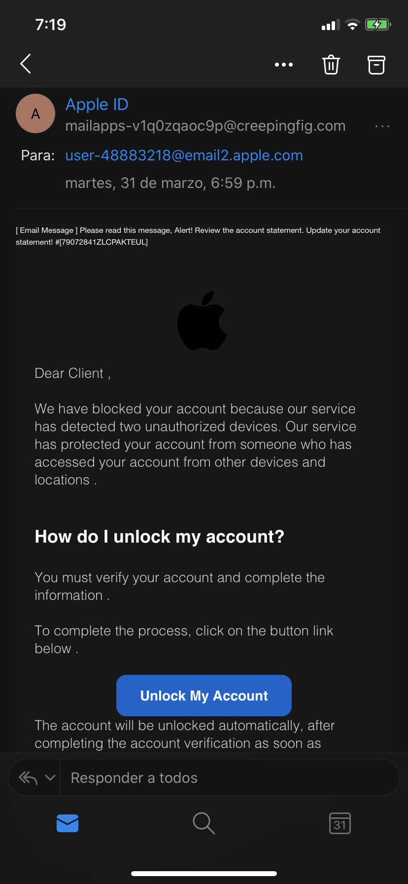 Se me envió un correo de "Apple ID" diciéndome que mi cuenta se había bloqueado porque se detectaron dos dispositivos no autorizados, lo que me parece extraño es que se me envió en inglés cuando a mi los correos de Apple siempre me llegan en español, el correo para el cual iba dirigido estaba extraño y no era el mío y también desde donde fue enviado no me pareció confiable, por último porque al abrir el botón adjunto me aparecía una página como si fuera la de Apple pero la zona donde está la manzanita, bolsa de compra y así estaban como borrosas y le aplastaba y no me llevaba a ningún lugar, por lo tanto me gustaría recibir su ayuda para saber si este es real.